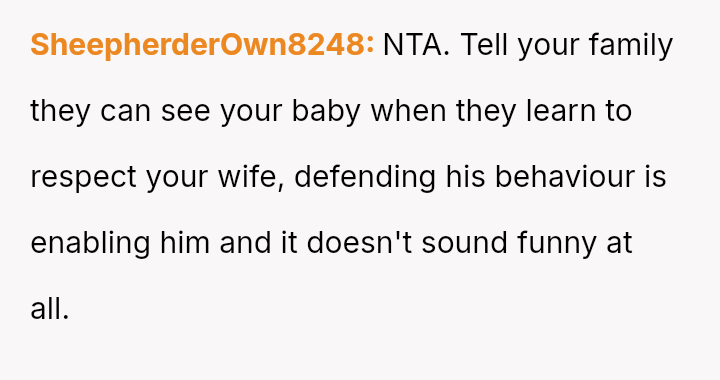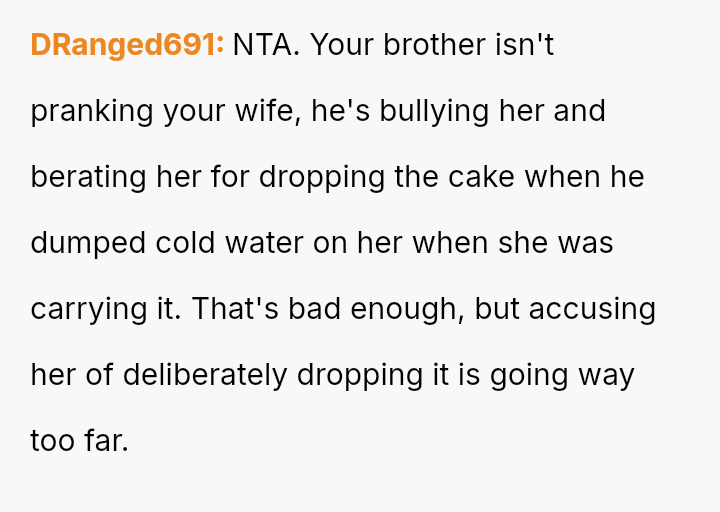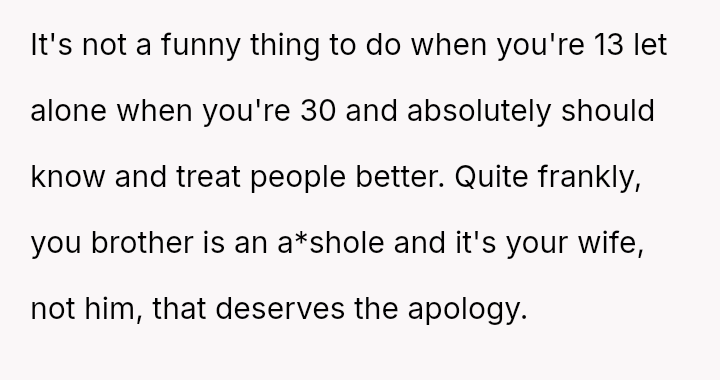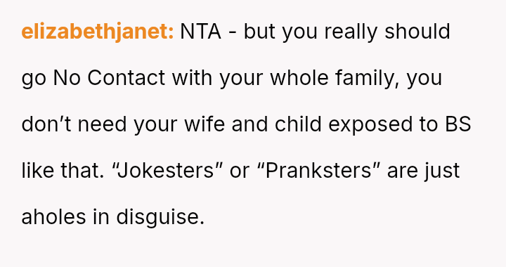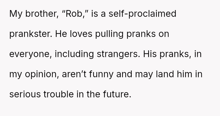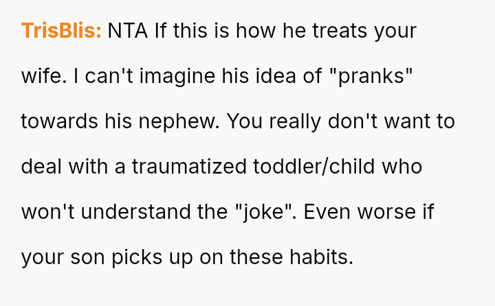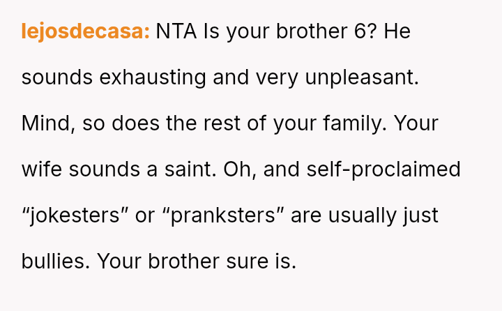The original poster (OP) is caught between defending his wife against his brother's harmful pranks and maintaining family peace, especially concerning visits with their new child.