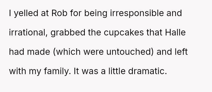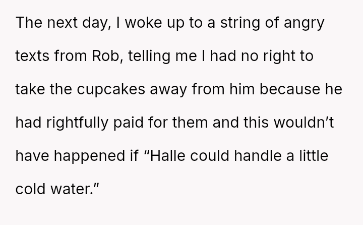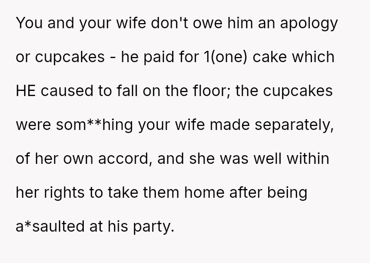 Given the es**blished pattern of h***ssment toward the wife and the direct physical provocation involving a paid-for item, was the OP justified in his immediate, angry exit and taking the cupcakes, or should he prioritize de-escalation and repair the relationship through an apology, as his wife suggests?