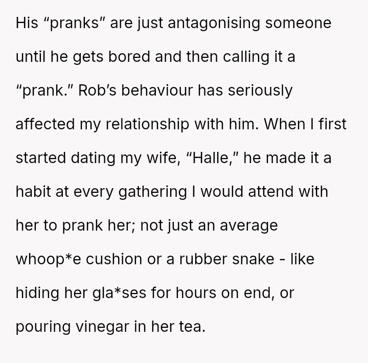 What he calls fun is a source of pain, especially for the narrator and his wife, Halle, whose patience has been tested time and again by Rob’s cruel antics aimed at undermining her dignity and peace.