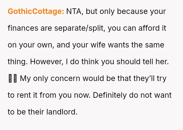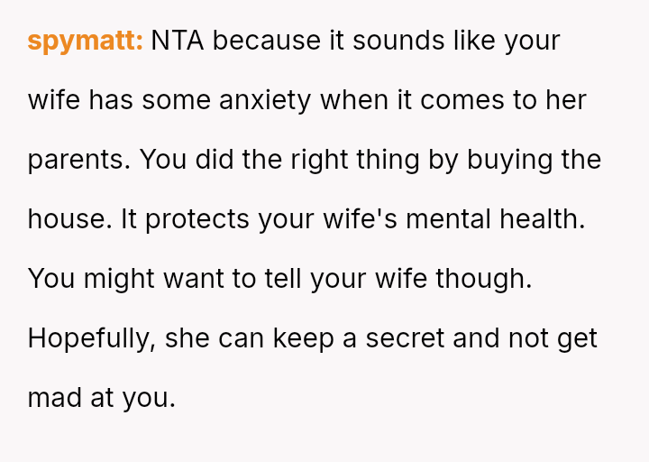 Was the OP justified in preemptively acquiring the property, using separate finances to circumvent potential conflict, or did this maneuver undermine his partnership by forcing his wife into a situation where she had to conceal a provocative action from her parents?
