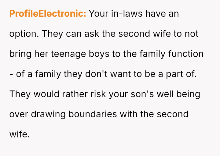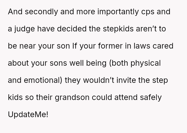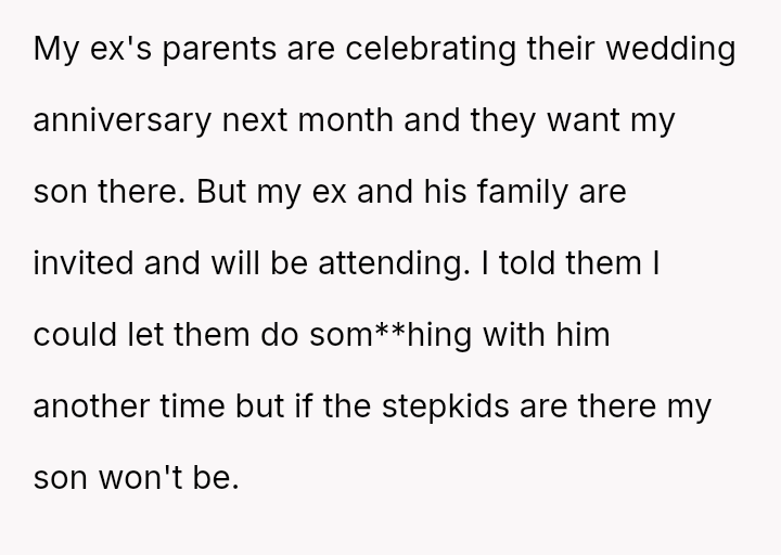 Now, the OP is facing pressure from the ex's family, including his parents, to allow their son to attend their upcoming anniversary party where the stepchildren will also be present, despite her explicit refusal.