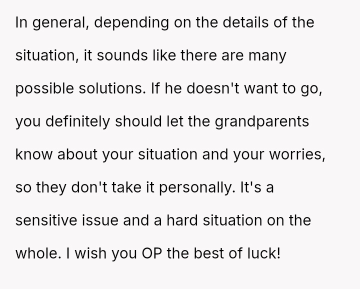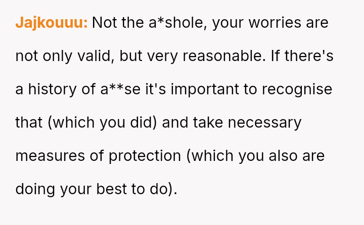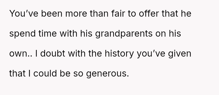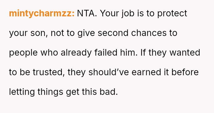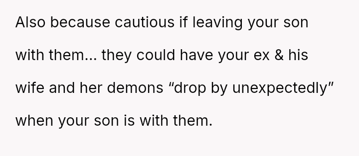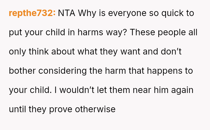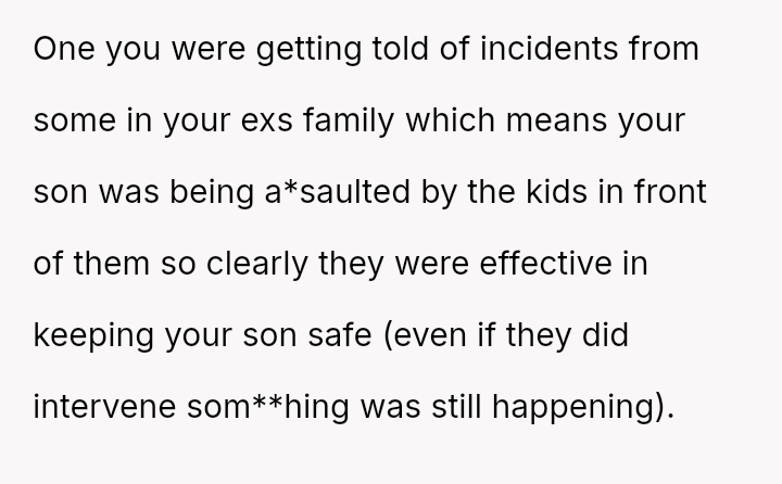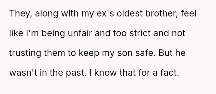 The OP is currently in a difficult position, prioritizing her son's safety based on documented past a**se, which conflicts directly with the expectations of her ex-partner's family, who feel she is being overly strict and untrusting.