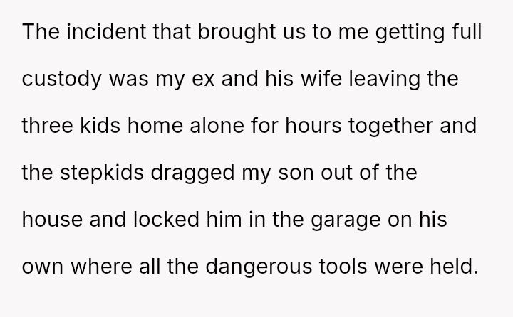 The situation escalated when the stepchildren locked the son alone in a garage with dangerous tools, leading to the custody ruling.