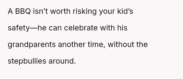 The central debate is whether the OP is justified in refusing visitation or attendance at family events where the known sources of past harm, the stepchildren, will be present, or if she should trust the extended family to manage the situation and allow her son to maintain those family ties.