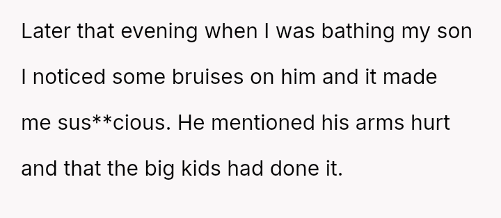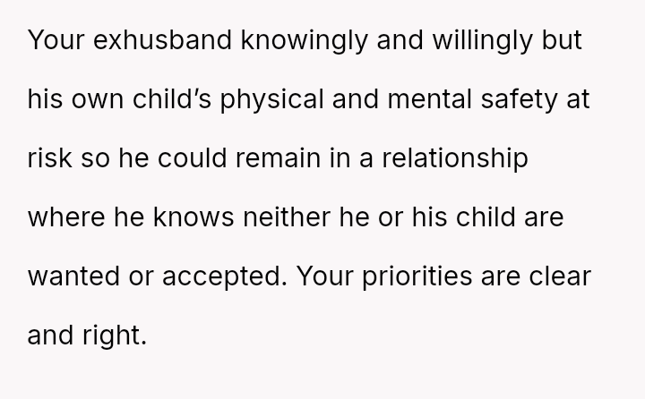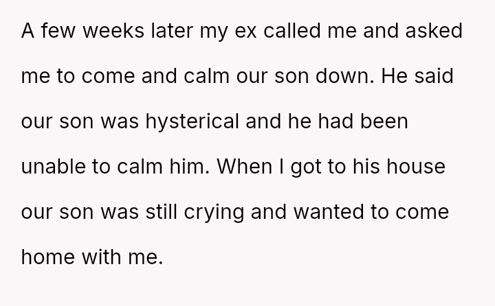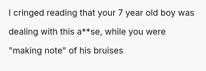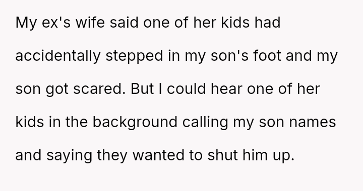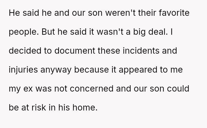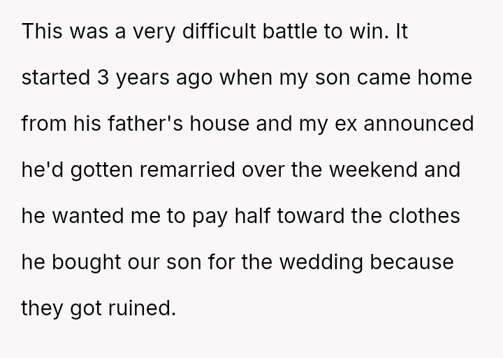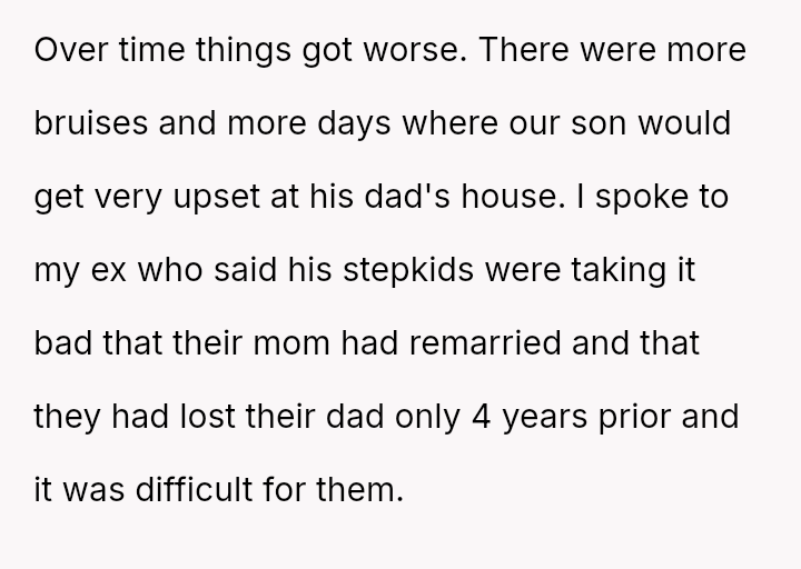 The conflict began three years prior when the ex remarried and requested the OP split costs for clothes damaged during a wedding event. Sus**cion arose when the OP discovered bruises on her son following this event.
