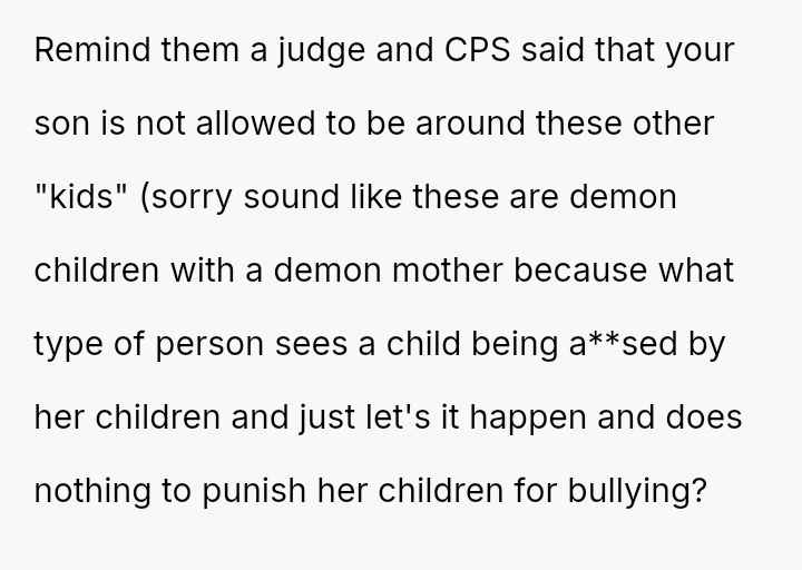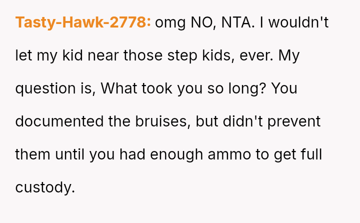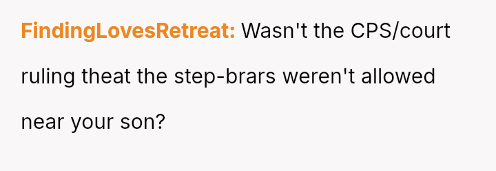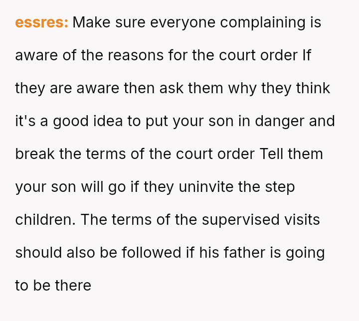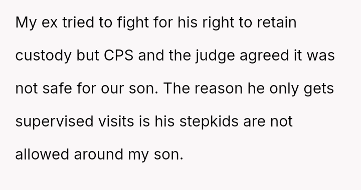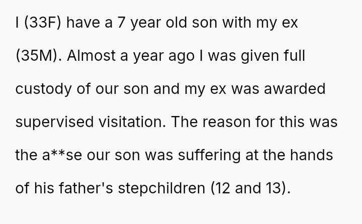 Nearly a year ago, the OP gained full custody because the son was allegedly being a**sed by his father's stepchildren, aged 12 and 13, resulting in the father only receiving supervised visitation.