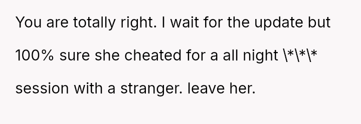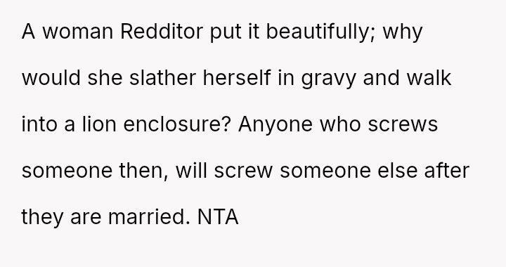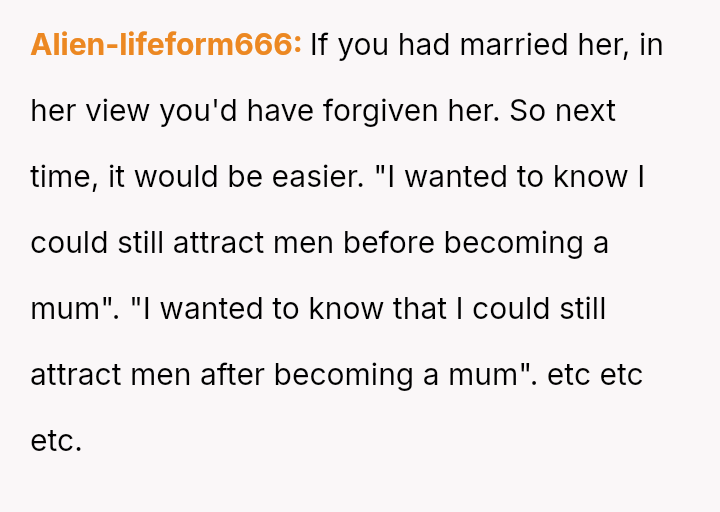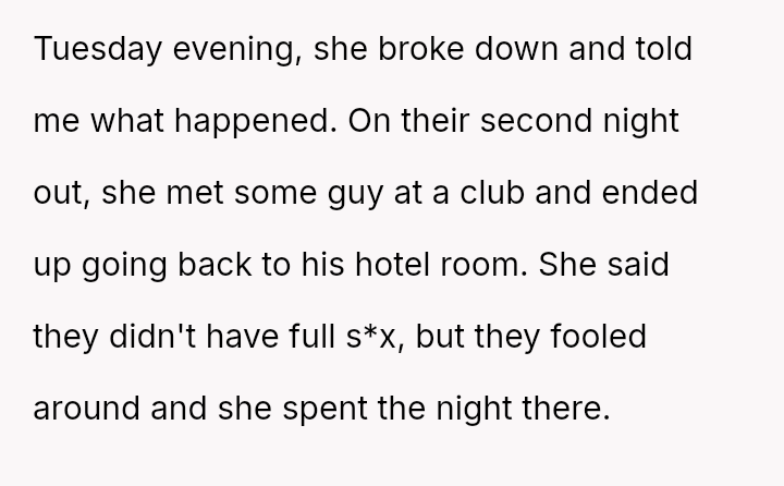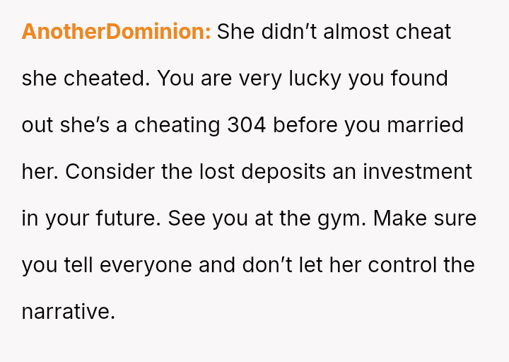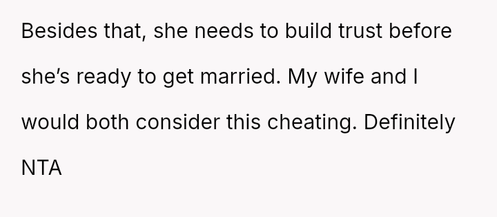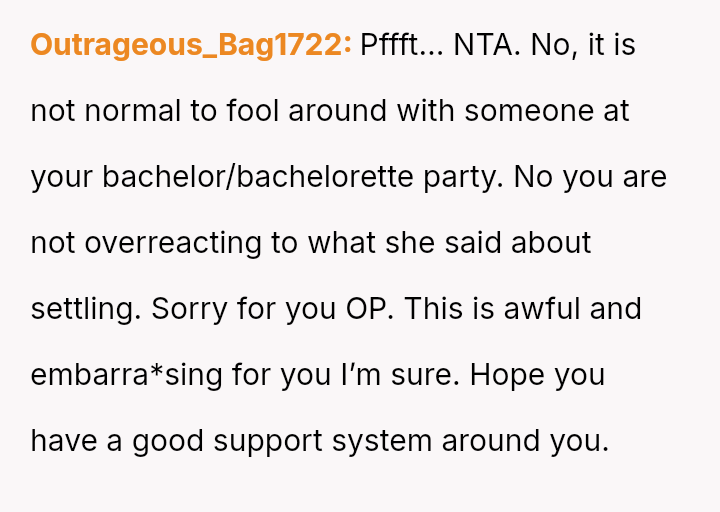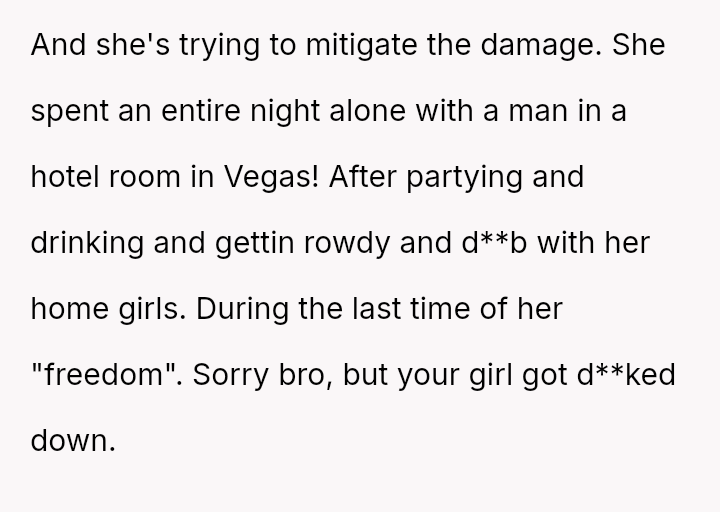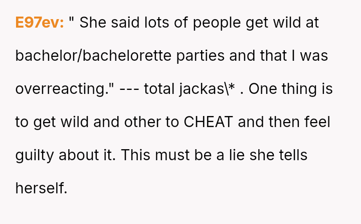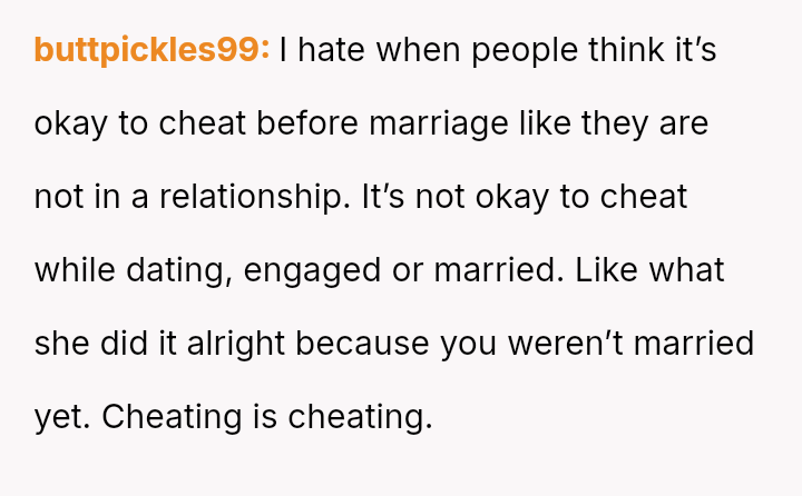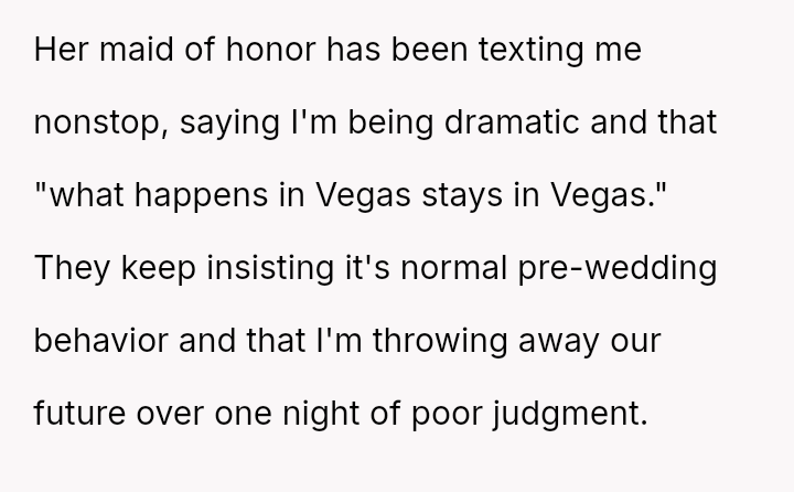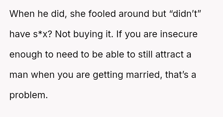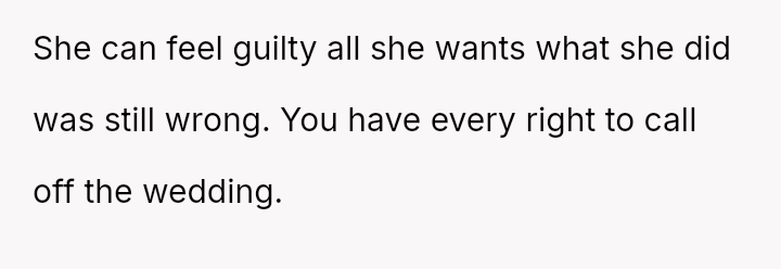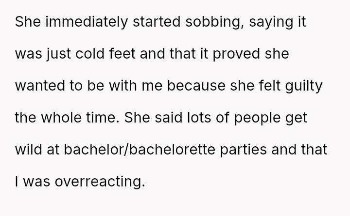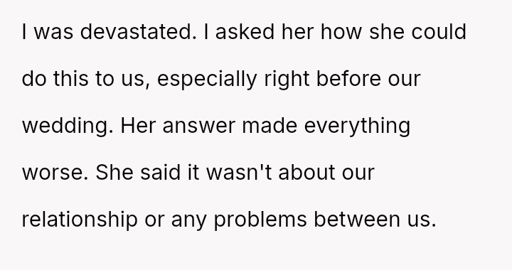 The original poster (OP) is facing profound devastation after his fiancée admitted to in***elity just before their wedding, framing the act as a final pursuit of freedom before marriage, which he interpreted as devaluing their commitment.