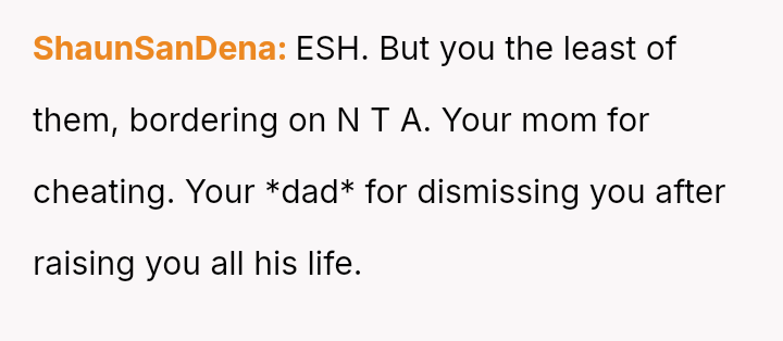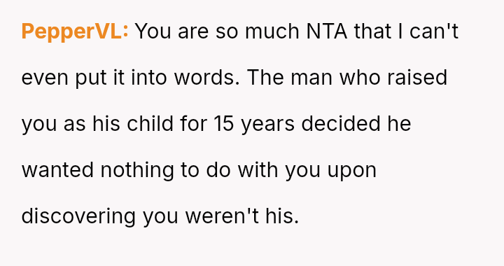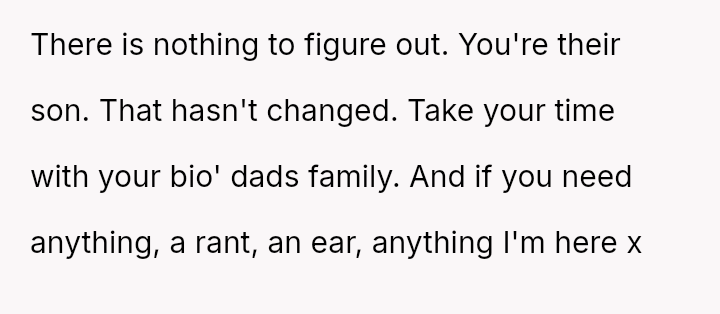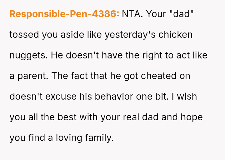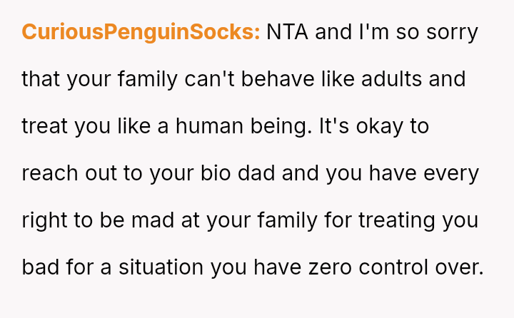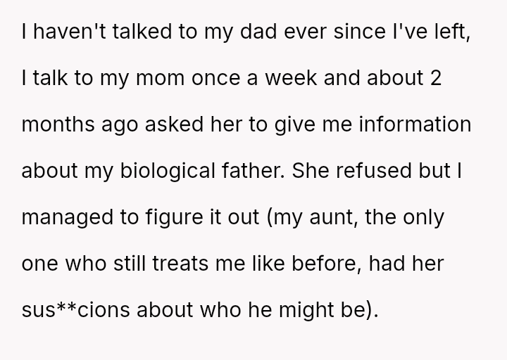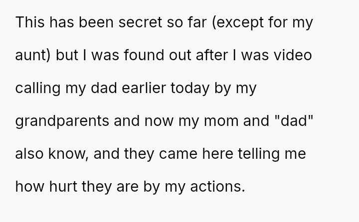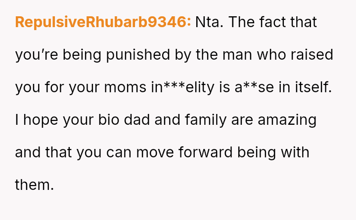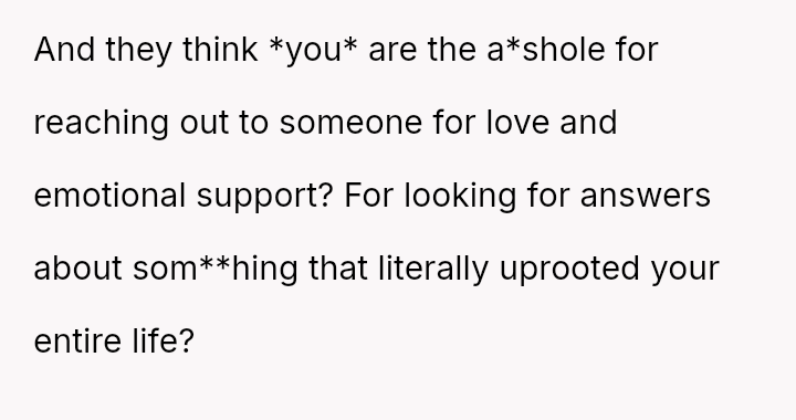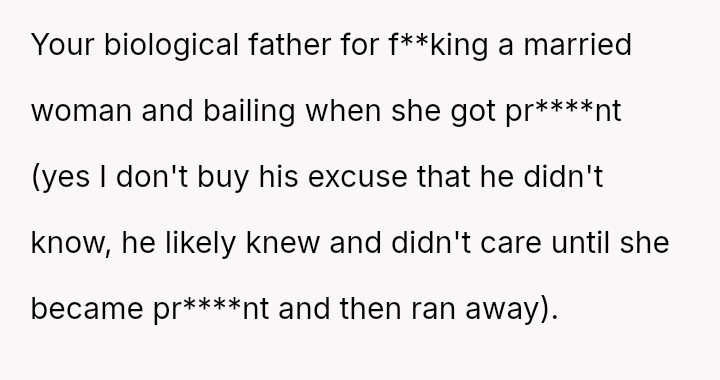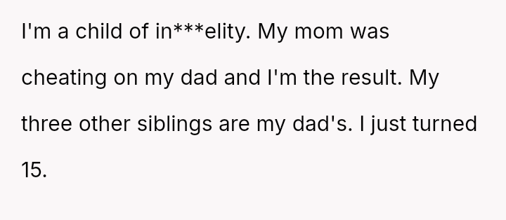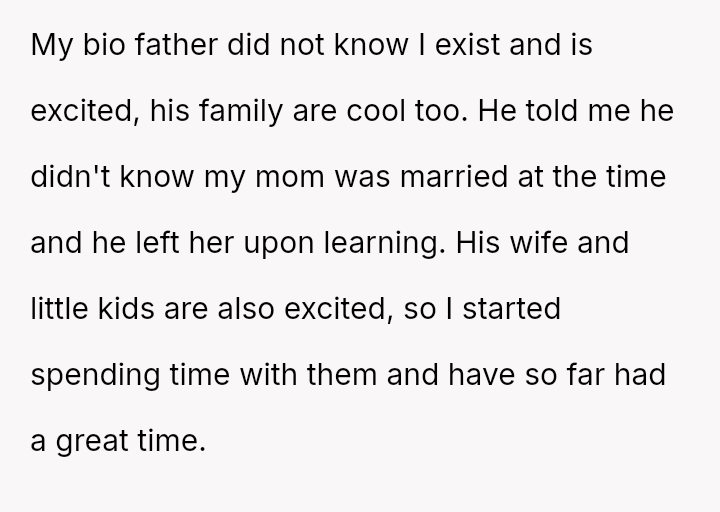 Given the complex web of secrecy, in***elity, and newly discovered family ties, the key question remains: Was the 15-year-old justified in independently seeking out and es**blishing a relationship with their biological father as a means of self-understanding and connection, or did this action const*tute an unfair betrayal of the family attempting to reconcile?