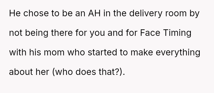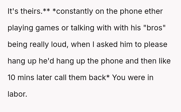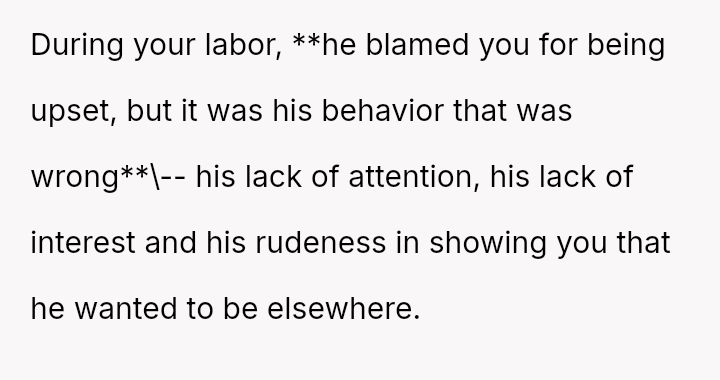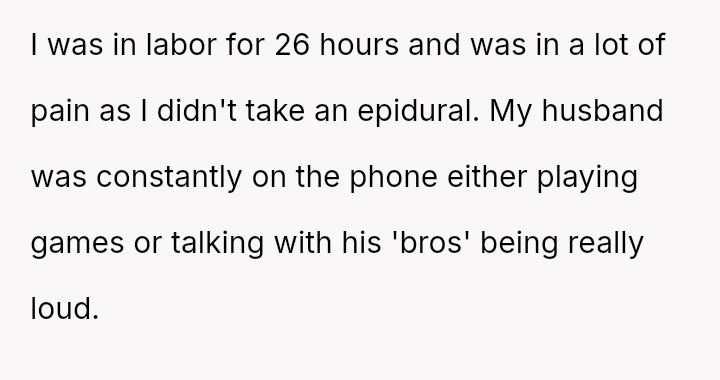 The original poster (OP) experienced extreme physical distress during a long labor and felt unsupported by her husband, who prioritized social calls and then failed to respect her need for quiet.