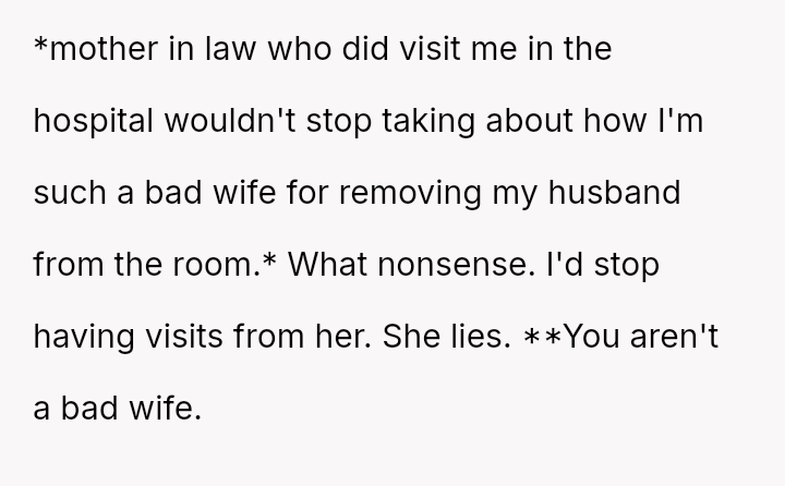The central conflict arose from the OP a*serting a boundary by asking for quiet and later asking the nurse to remove her husband, which directly clashed with the husband's expectation of constant access and the mother-in-law's judgment regarding wifely duties.