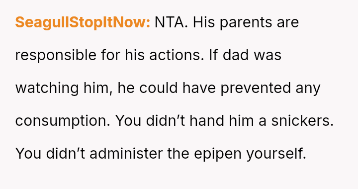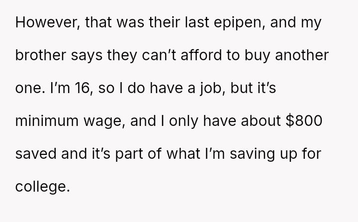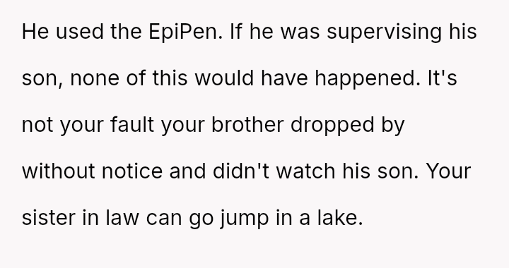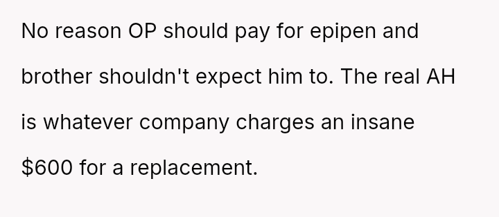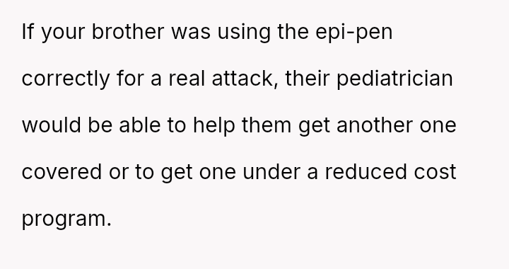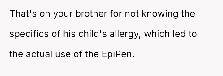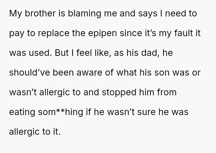 Should the OP bear the financial responsibility for replacing the EpiPen, given that their action was an immediate, fear-driven response to a perceived life-threatening exposure, or does the father (the brother) hold ultimate responsibility for monitoring his child's ingestion of unknown foods and managing the necessary emergency medication?