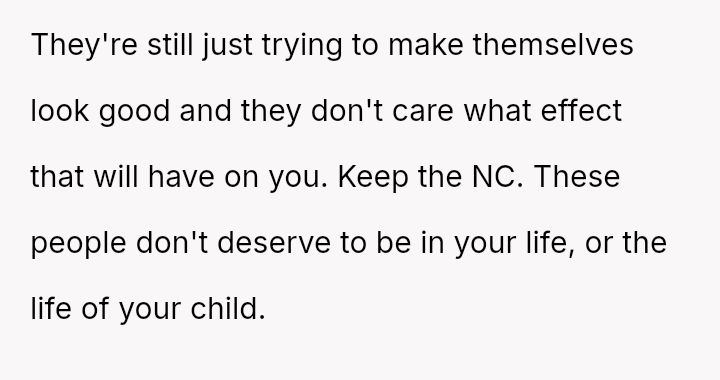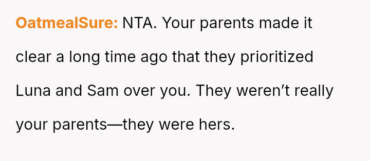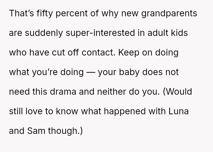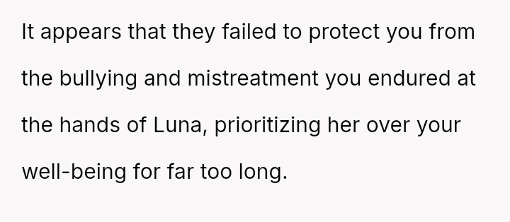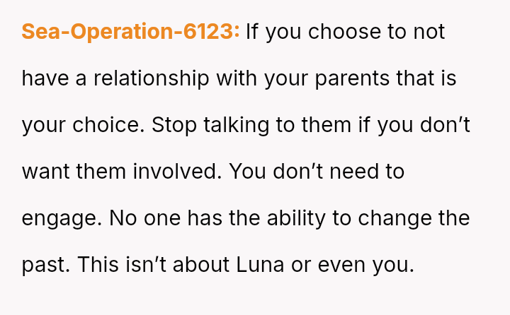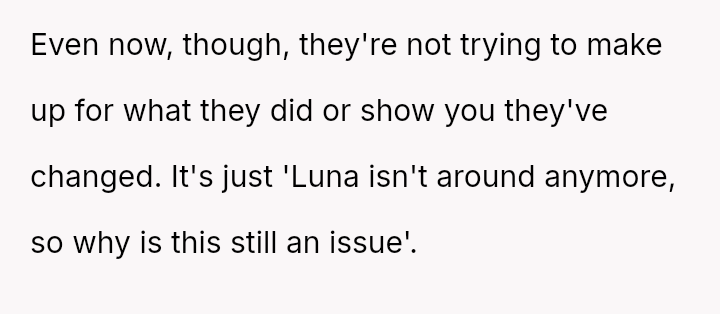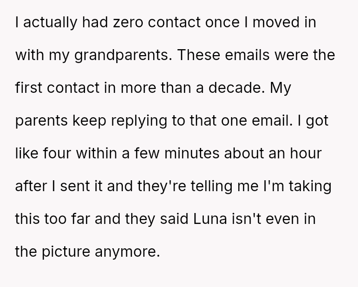 Despite this explicit boundary, her parents have continued to reply to the email, arguing that she is overreacting and claiming the source of past conflict, Luna, is no longer an issue, leaving the user questioning her actions.