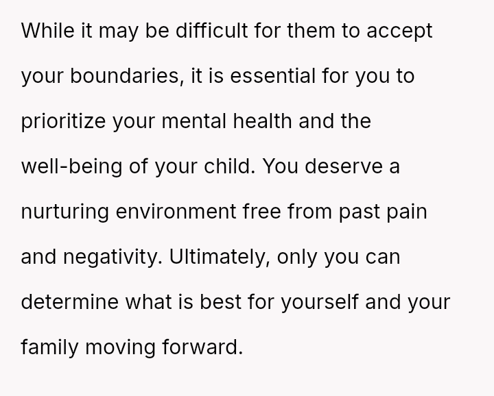 This results in a conflict between her need for protective boundaries for herself and her coming child against her parents' current desire for inclusion and reconciliation.