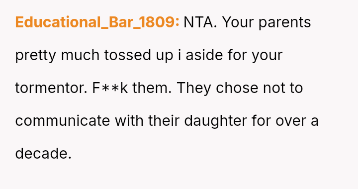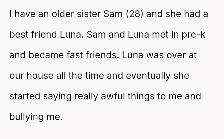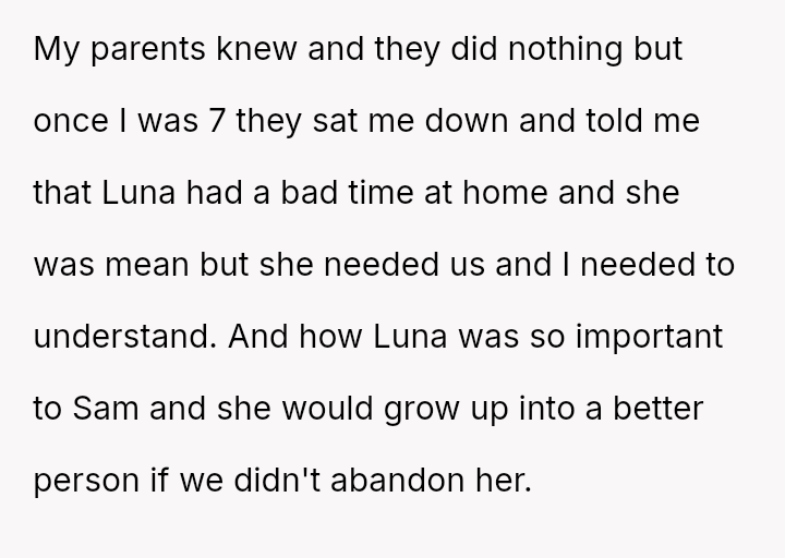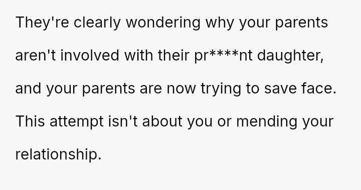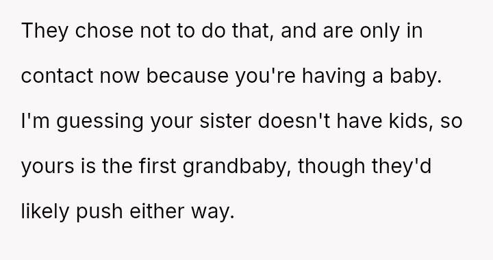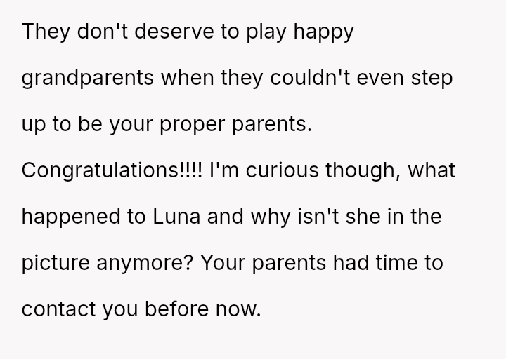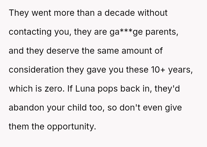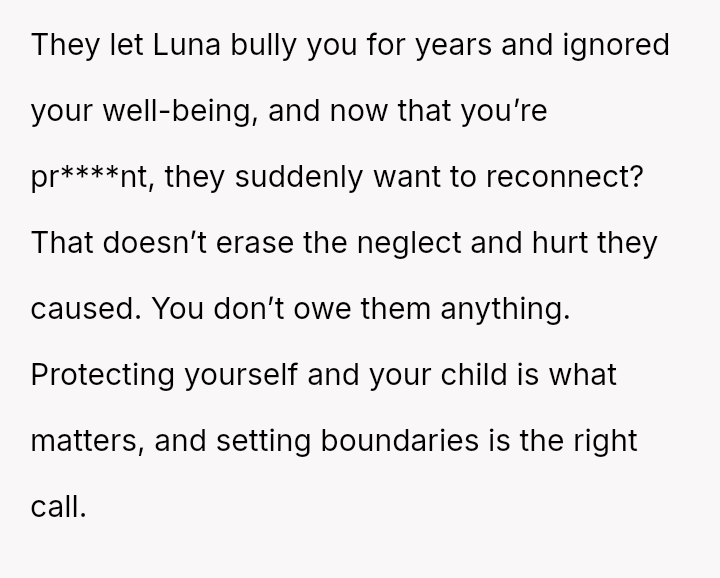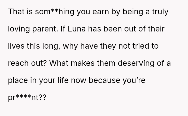 The core question remains whether cu***ng off contact entirely, especially now that she is pr****nt, is an overreaction given the parents' a*sertion that the historical issue (Luna) is resolved, or if the decade-plus of silence validates her decision to protect her new family unit from further emotional harm.