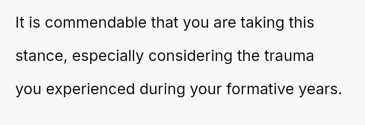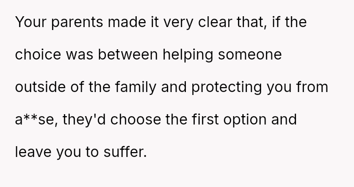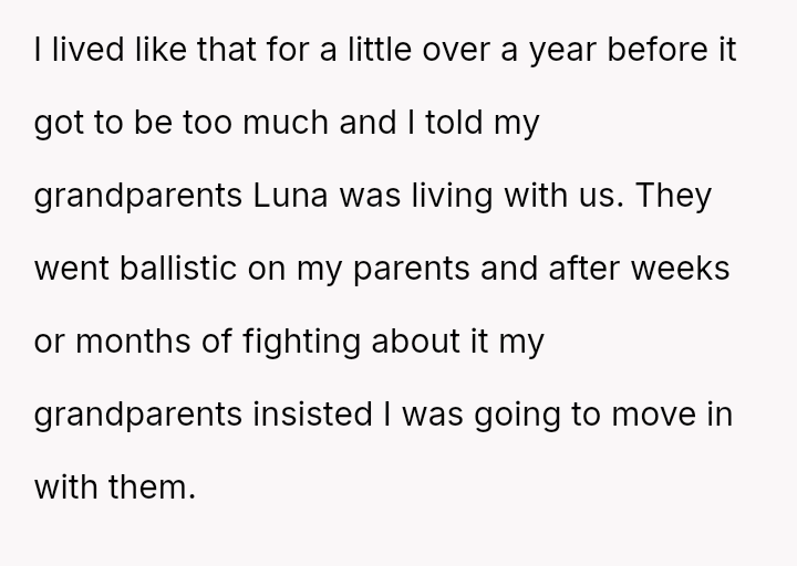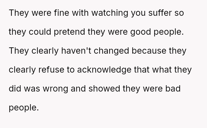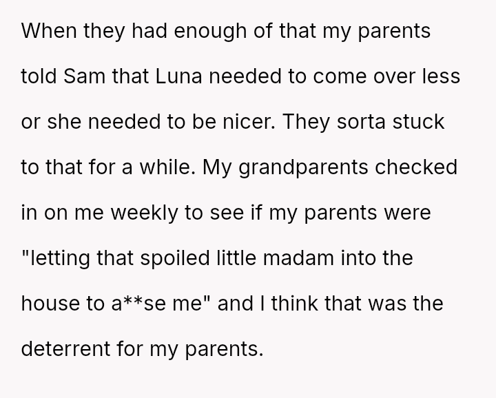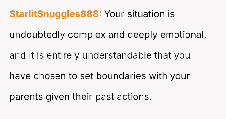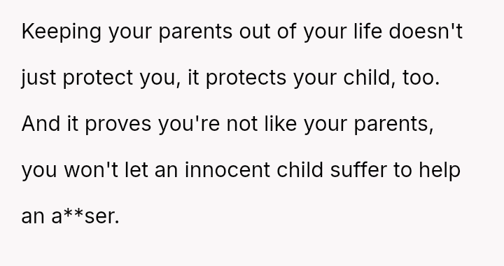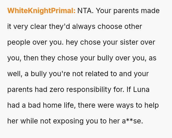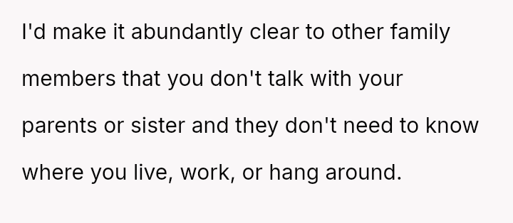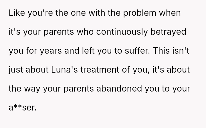 The user is currently standing firm on maintaining complete separation from her parents due to years of unaddressed emotional a**se related to her sister's friend, Luna, which her parents prioritized over her well-being.
