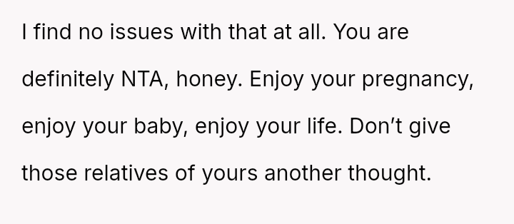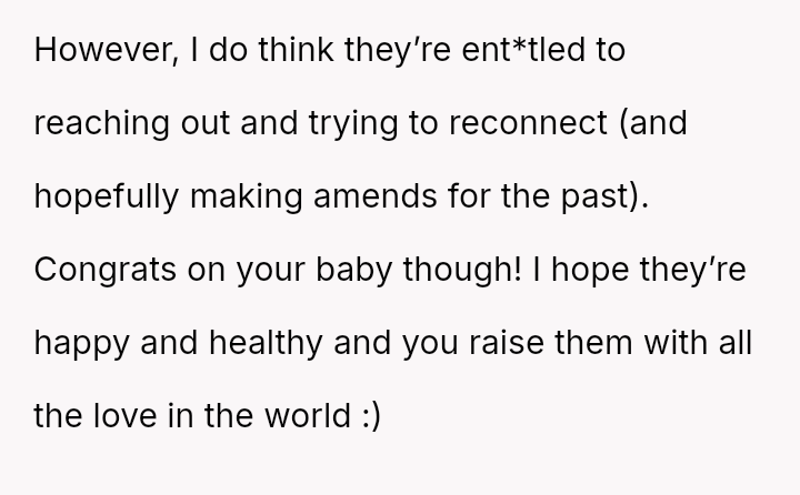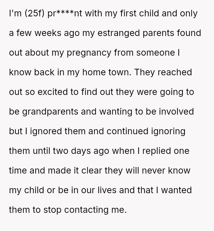 The user, a 25-year-old female, recently announced her first pregnancy after being estranged from her parents.
