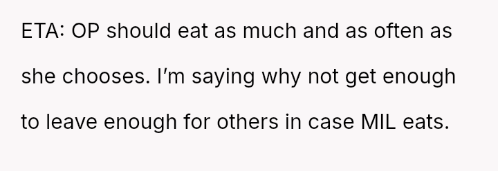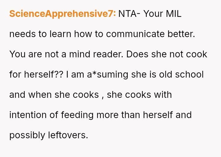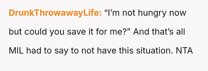 Was the OP obligated to save food for the MIL despite her stating she was not hungry, or was the MIL’s expectation of the OP to foresee her needs and store food an unreasonable imposition?