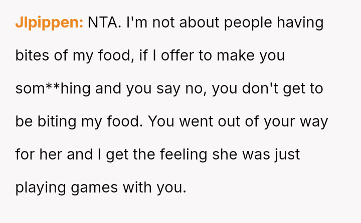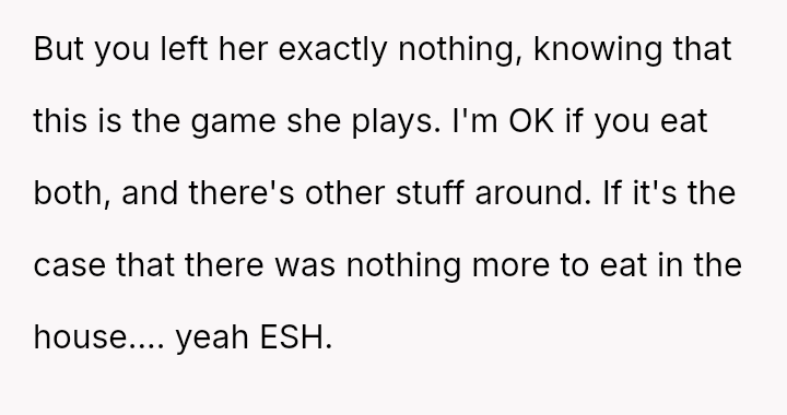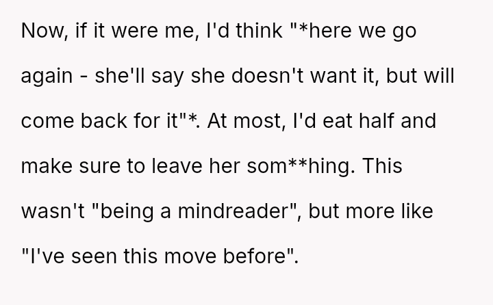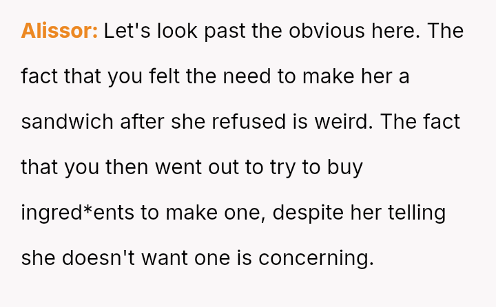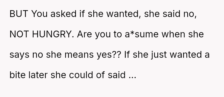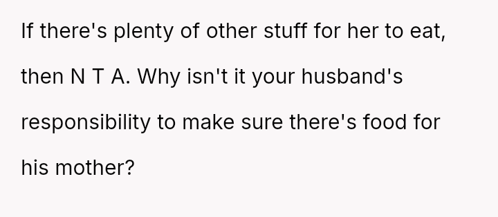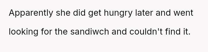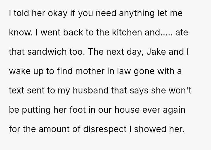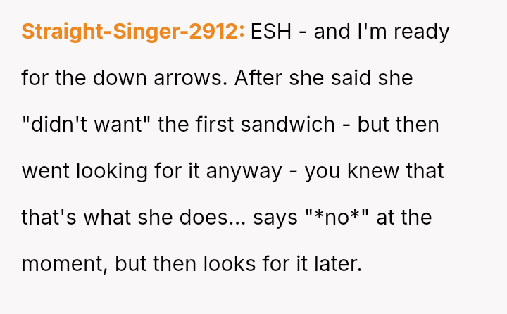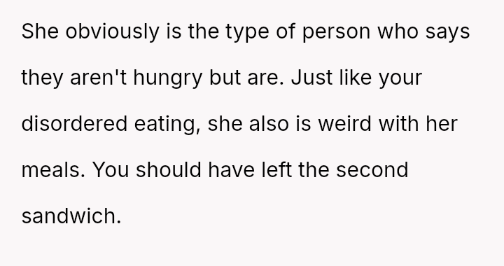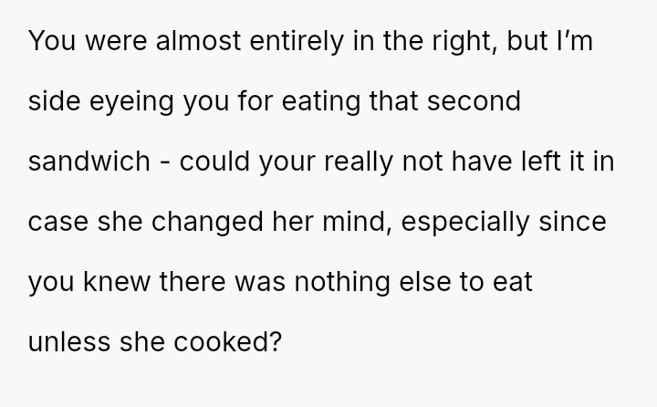 However, the MIL interpreted the OP's actions, particularly finishing the sandwich and eating the replacement, as intentional disrespect and a failure to anticipate her potential future needs.
