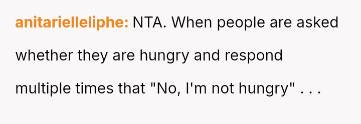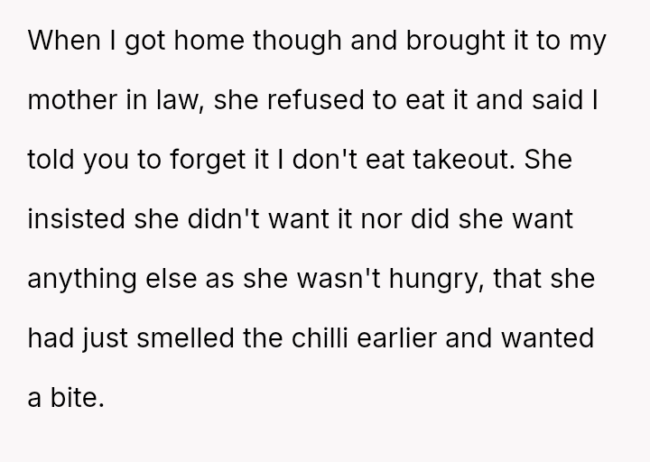 The original poster (OP) acted based on clear communication—the mother-in-law (MIL) explicitly declined food and later refused an offered replacement.
