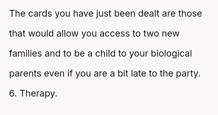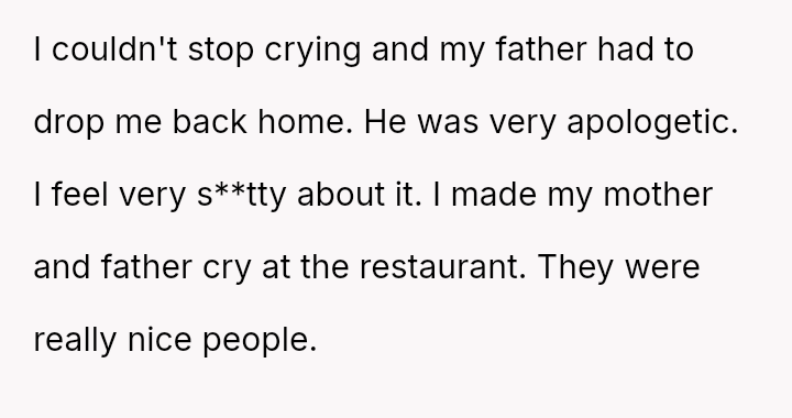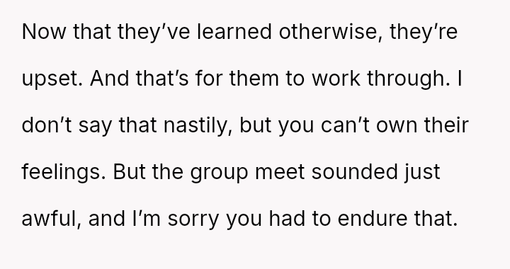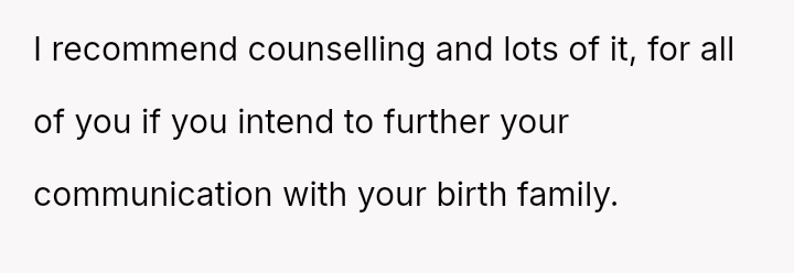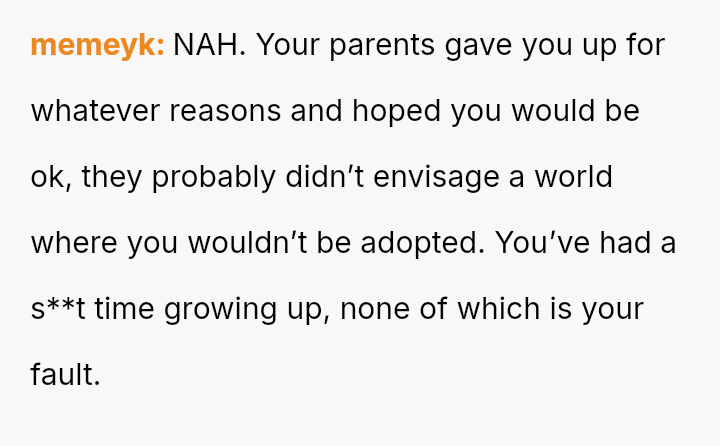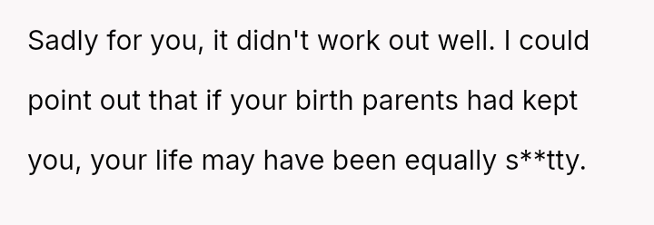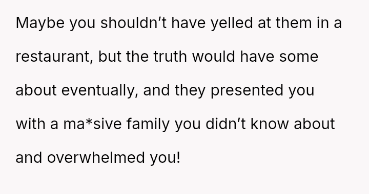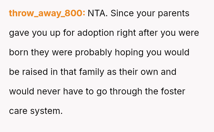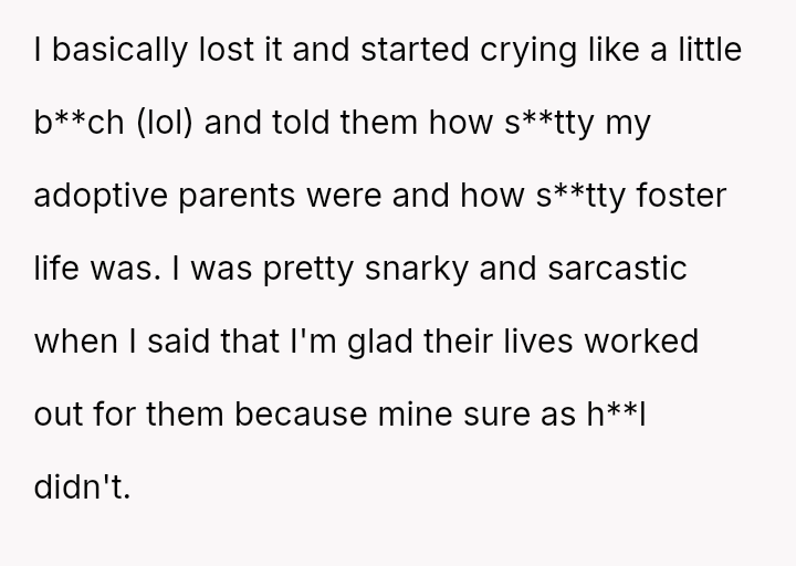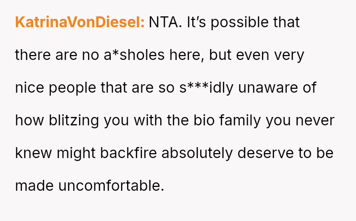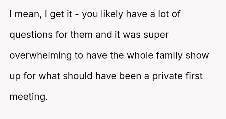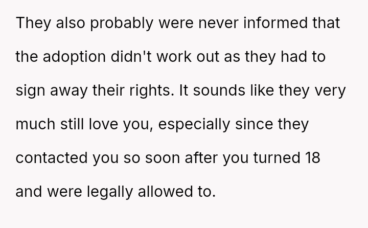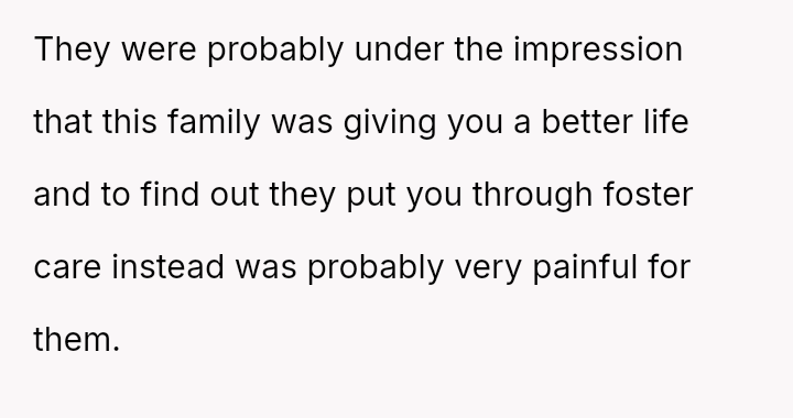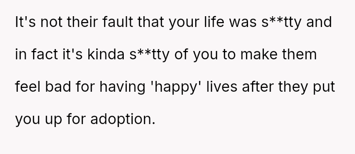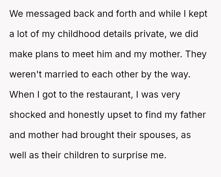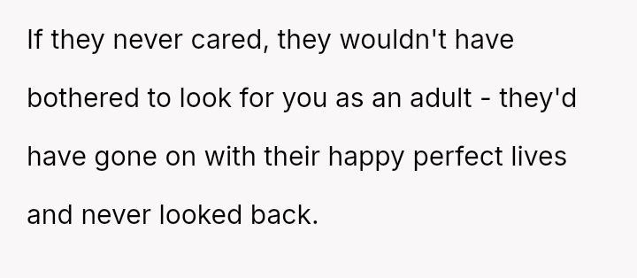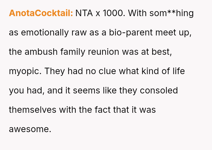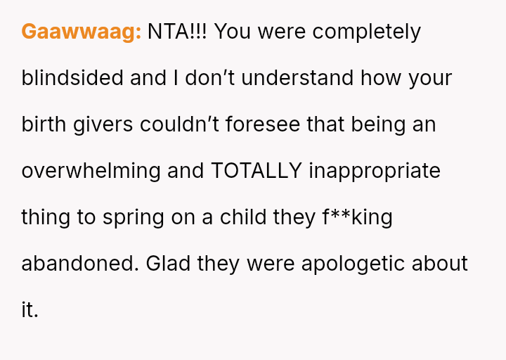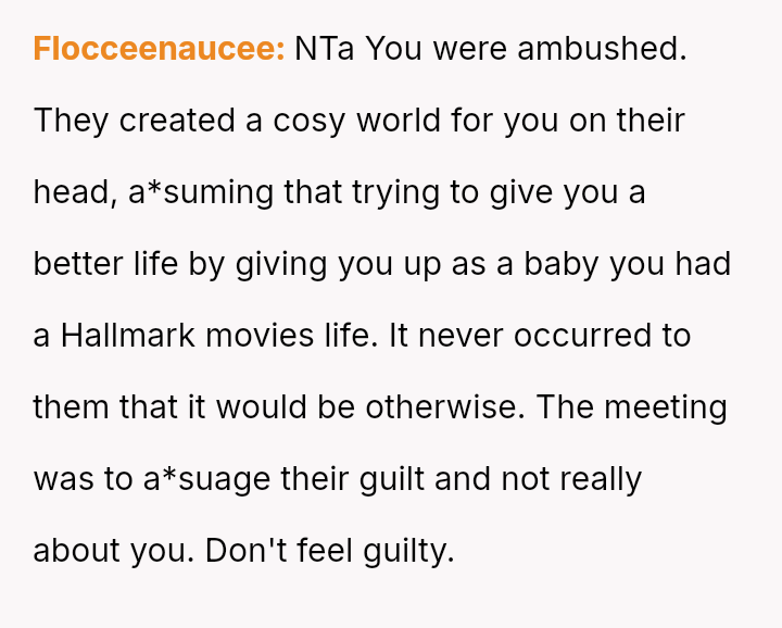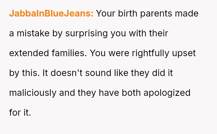The conflict centers on the OP's sudden, raw honesty, which brought pain to the biological parents, who appeared to have structured the reunion in a way that did not account for the OP's potential emotional state.