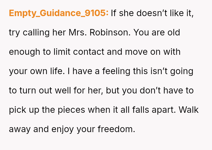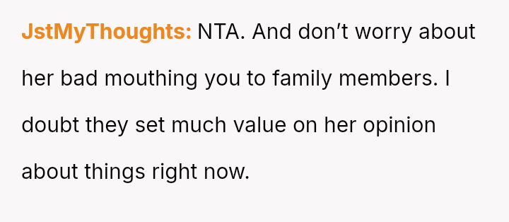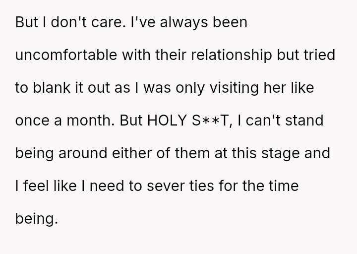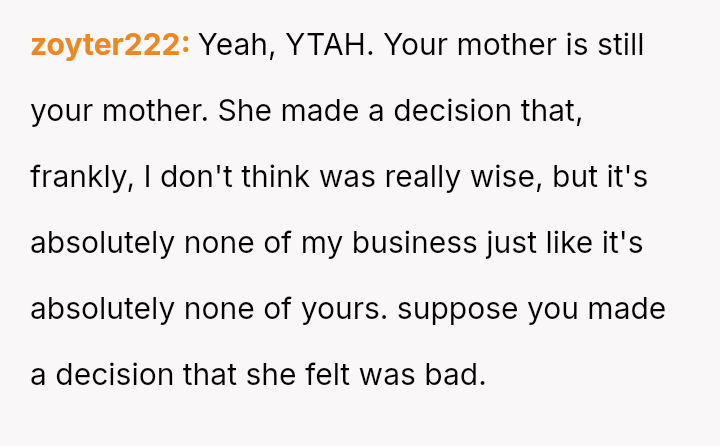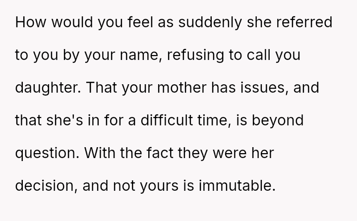 The mother has reacted negatively to this change in address, making critical remarks and complaining about the user to other family members, leading the user to consider completely severing contact for a period.