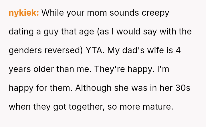 The user is experiencing a major ident*ty crisis regarding their relationship with their mother, rooted in the age difference between the mother and her new partner, which has made the es**blished familial role feel invalid to the user.