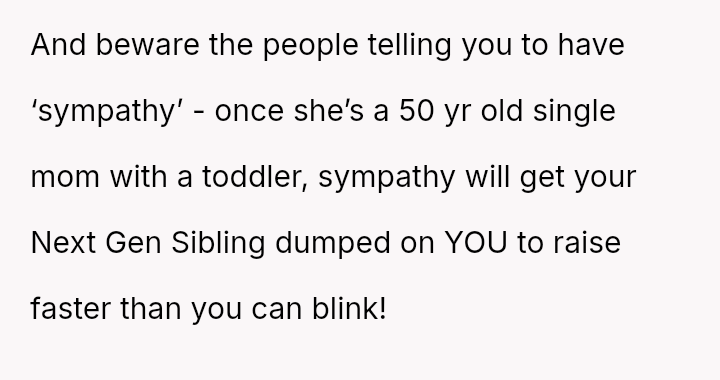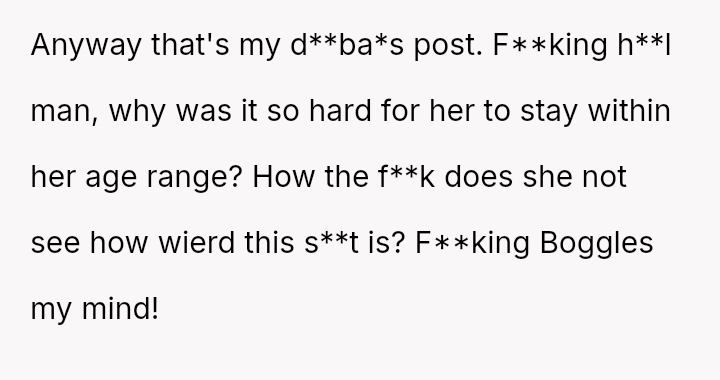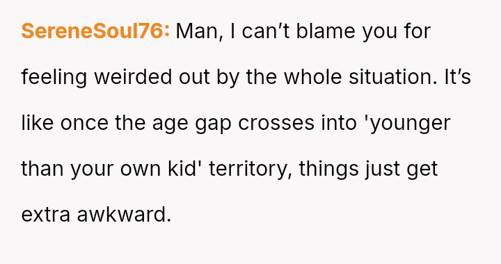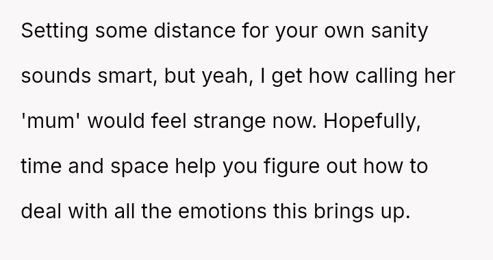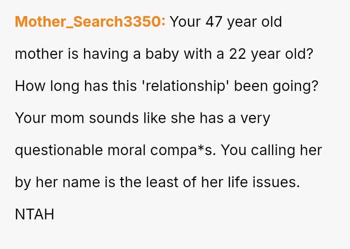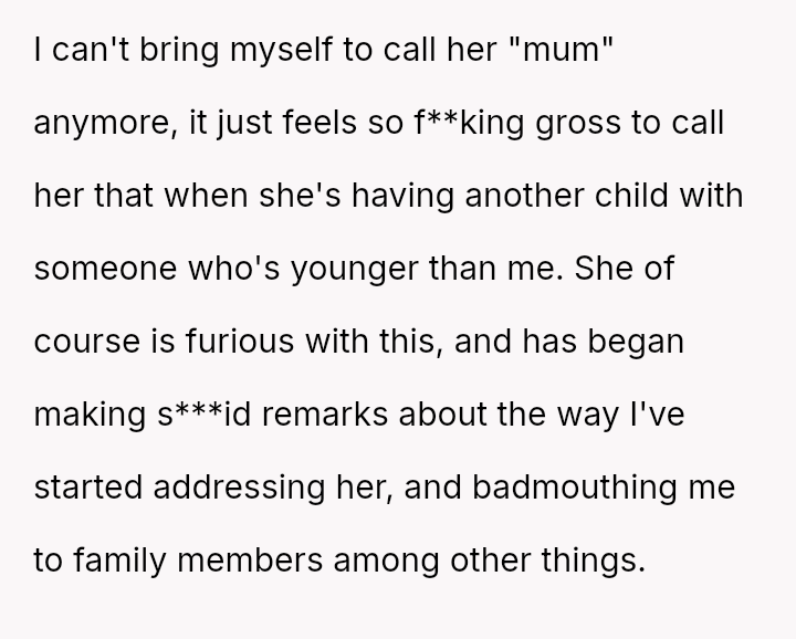 Due to this shift, the user can no longer bring themselves to use the familiar term "mum," finding it inappropriate given the circumstances of the new child's father being younger than them.
