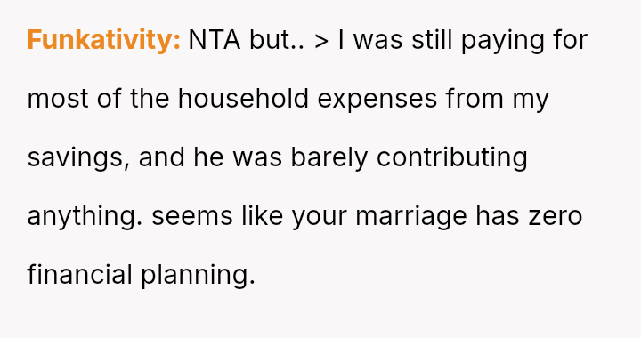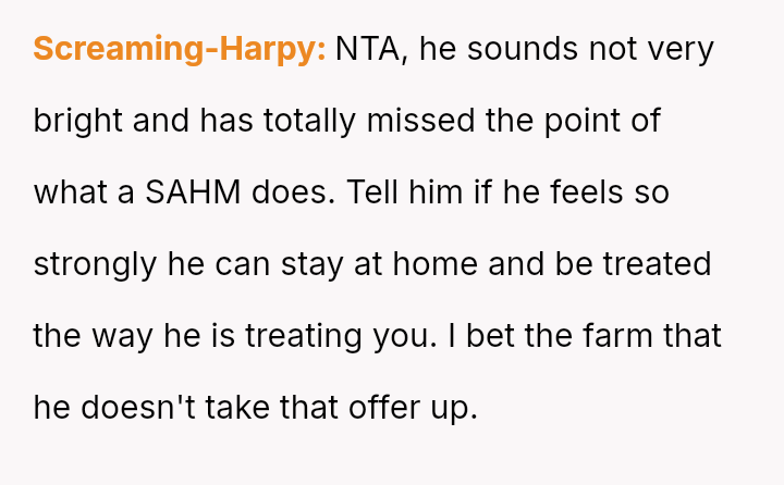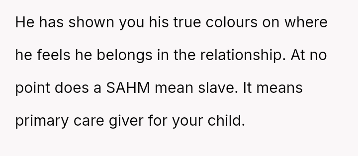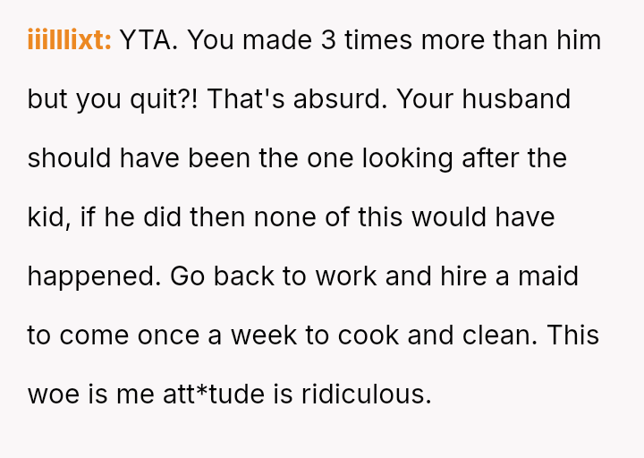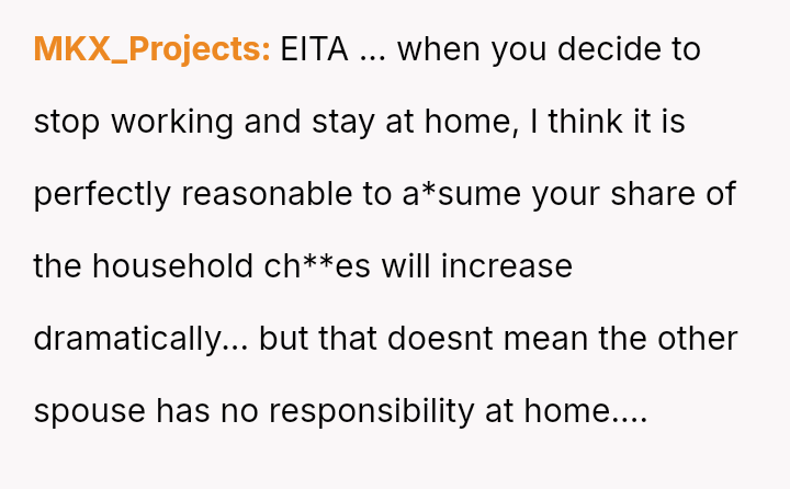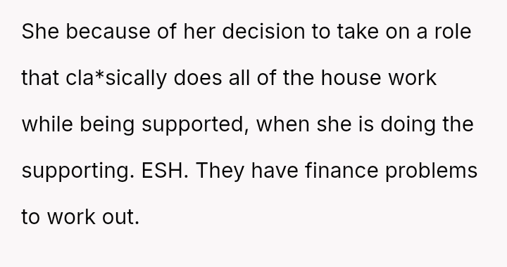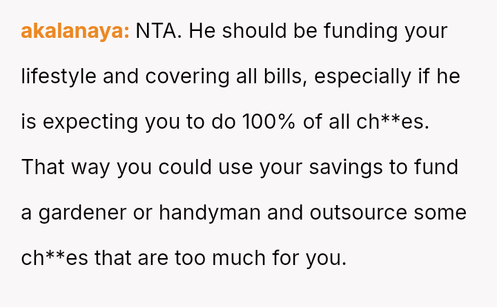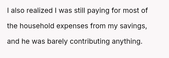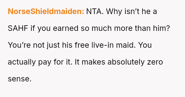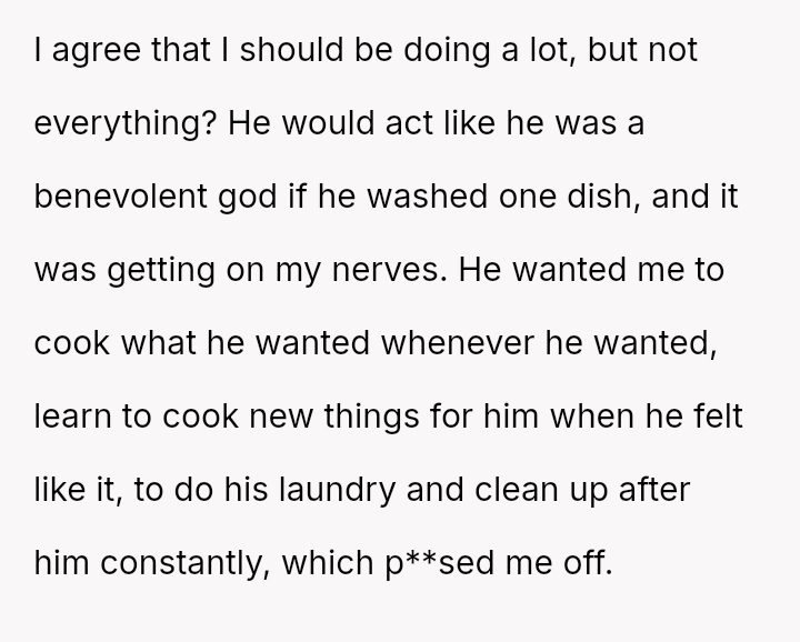 However, this arrangement devolved into the OP carrying the entire burden of domestic labor while simultaneously funding the household, leading to feelings of being treated as a servant rather than an equal partner.