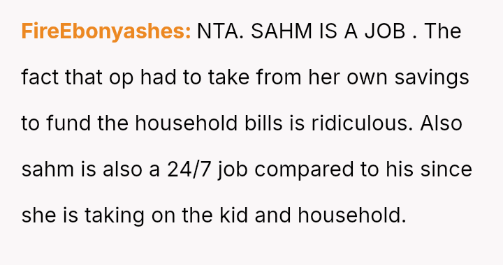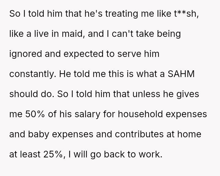 Given the complete imbalance in contribution—financial, domestic, and emotional—is the OP justified in demanding a 50% financial contribution and 25% physical contribution from the husband, or is the husband correct that this level of service is an inherent expectation of a stay-at-home parent?