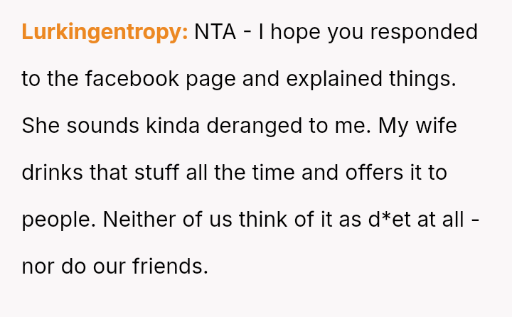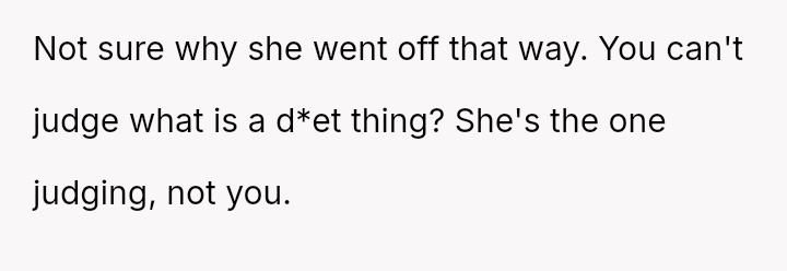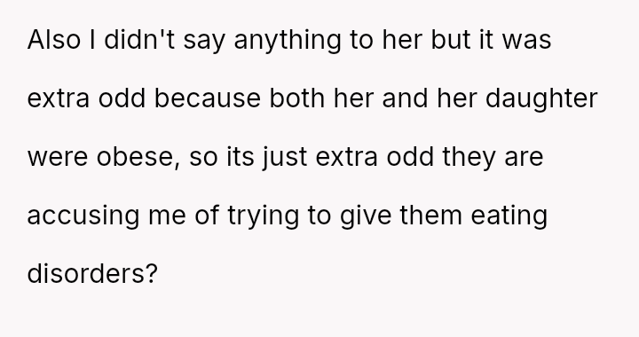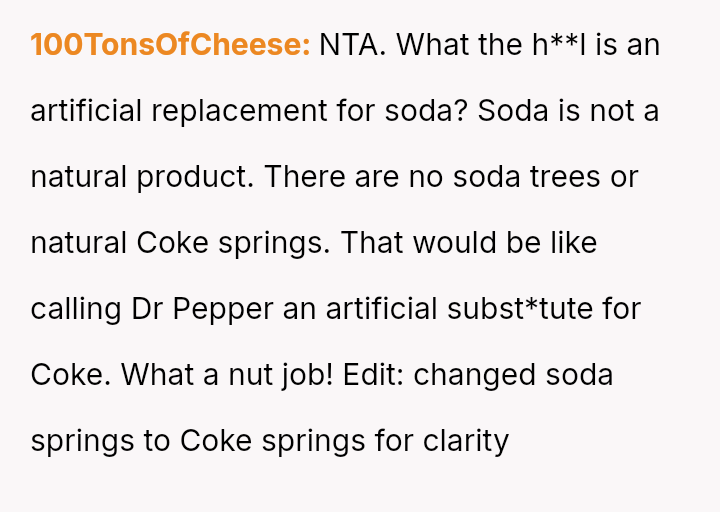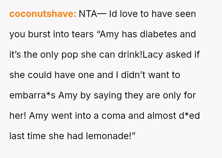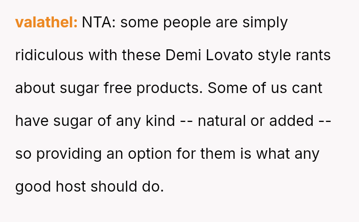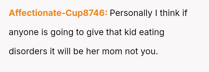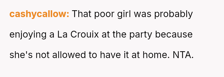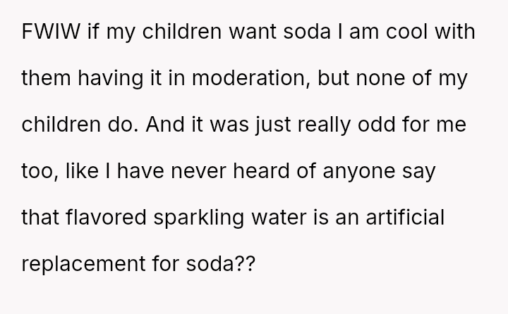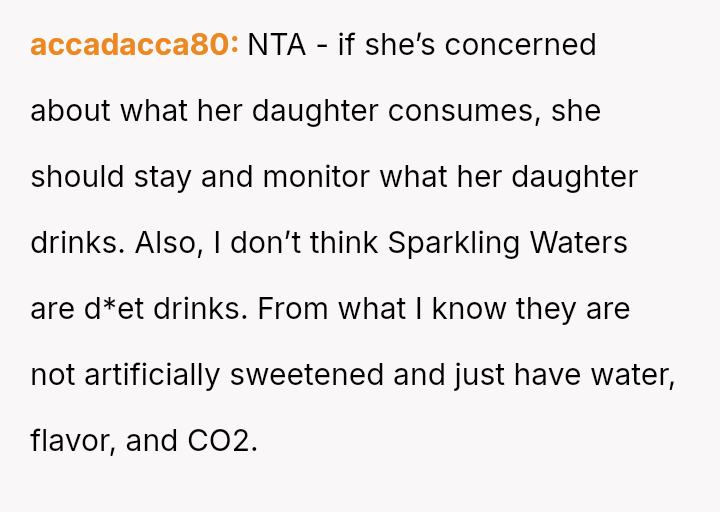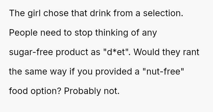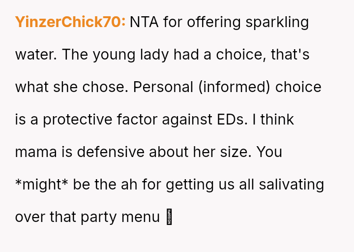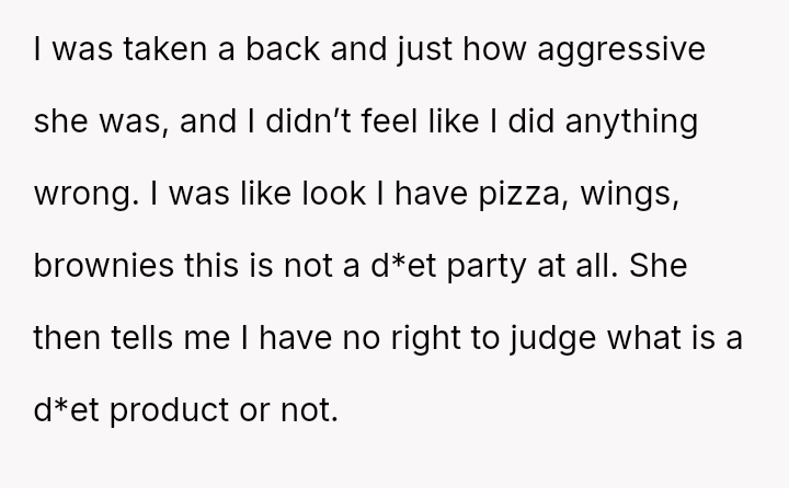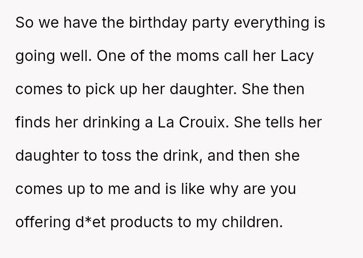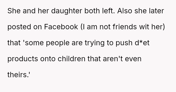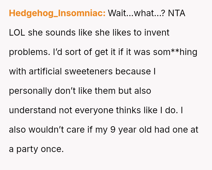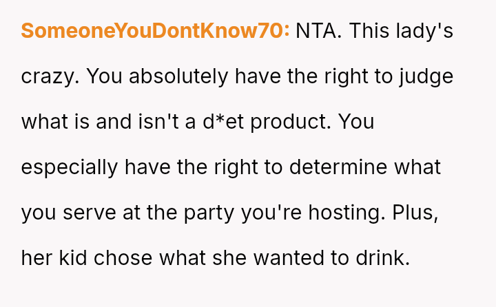 The core conflict stems from the mother's strong, unso***ited personal judgment regarding d*et-related products being offered to her child, which the OP felt was completely unwarranted given the context of the party food.
