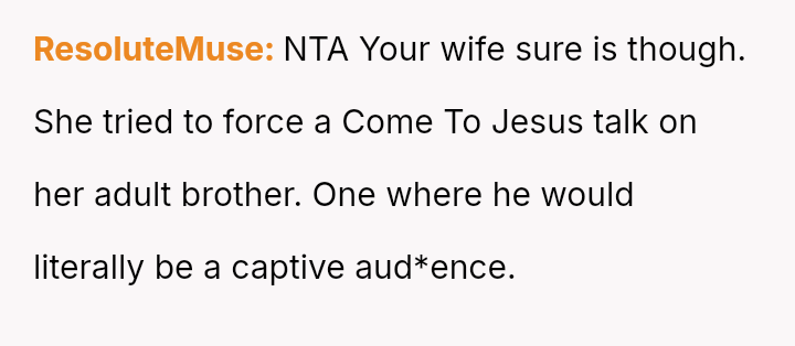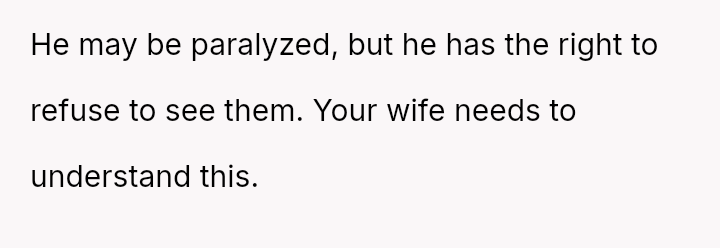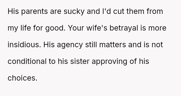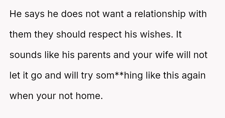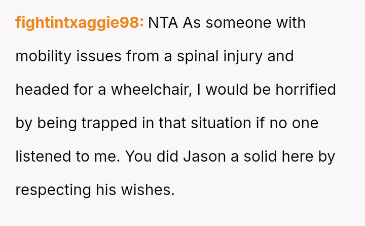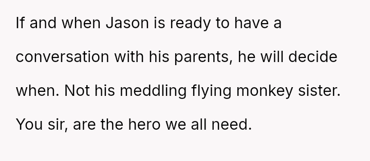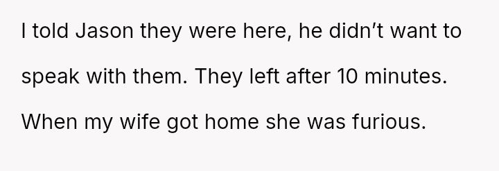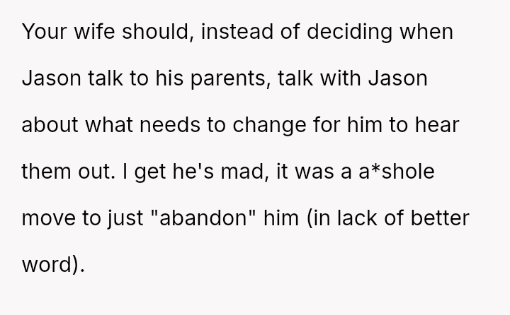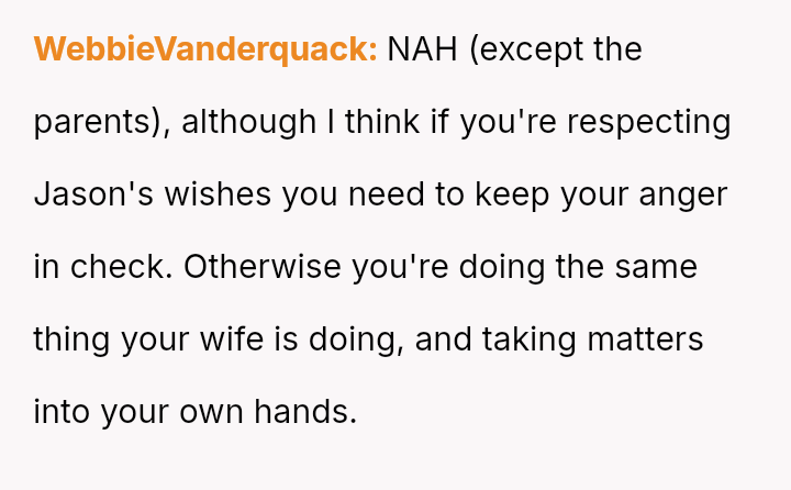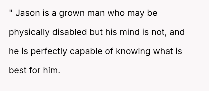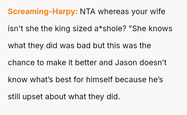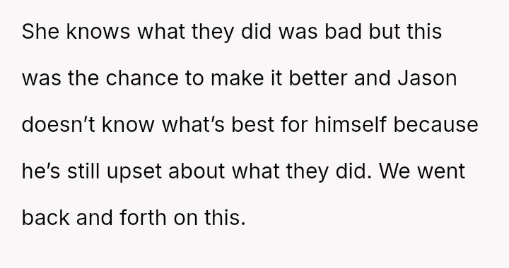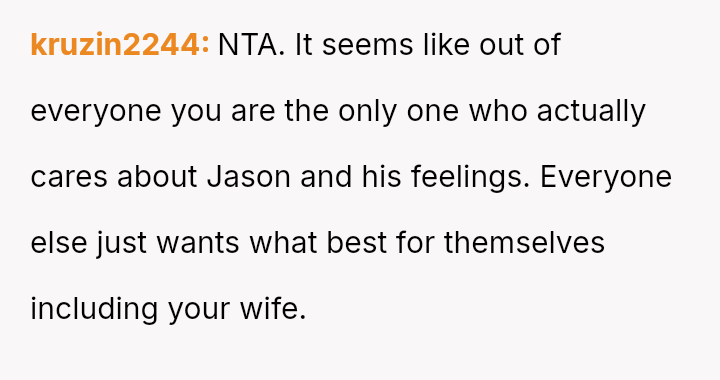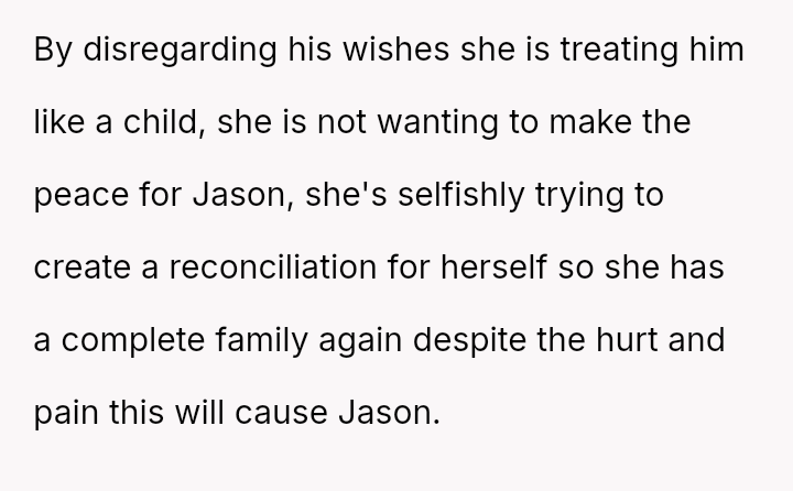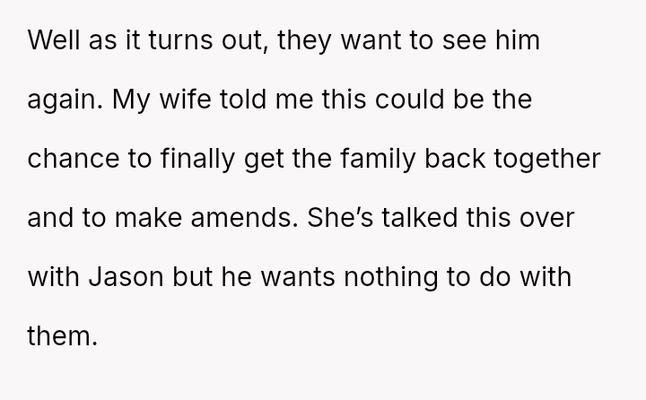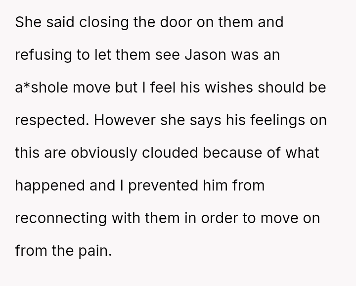 This action created a major conflict with the OP's wife, who prioritizes family reconciliation, even if it means overriding Jason's current stated wishes based on his emotional state.