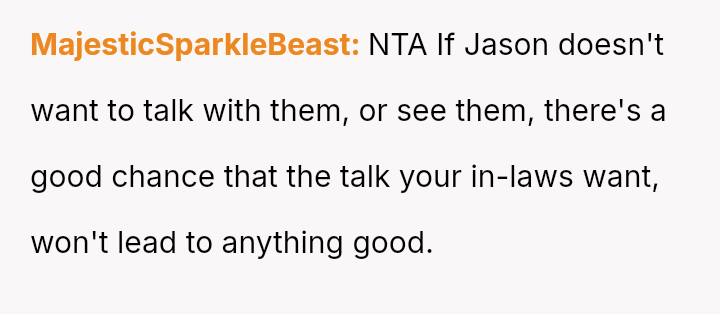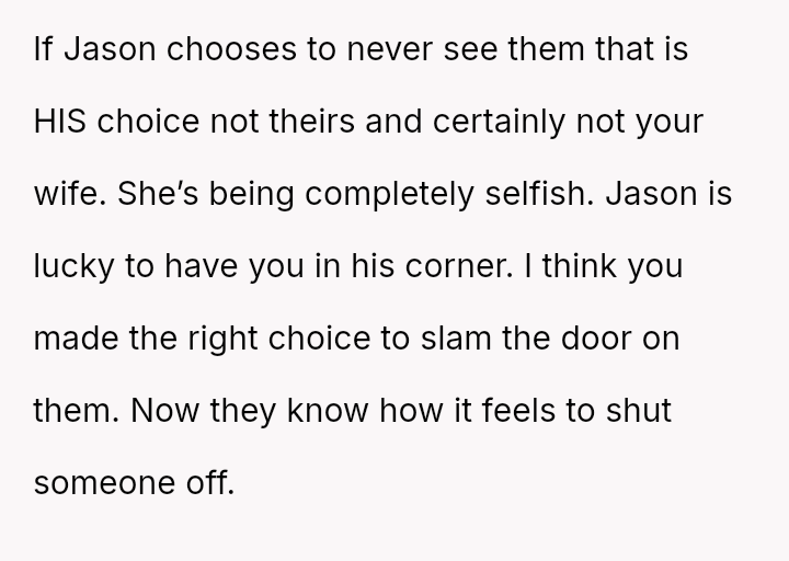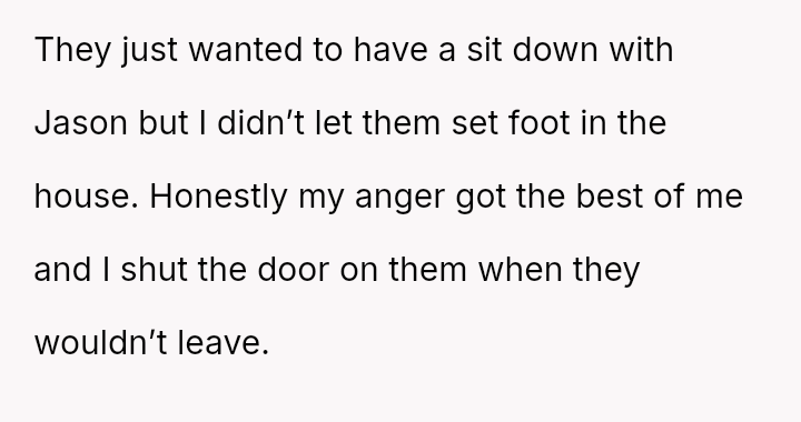 Is the OP correct to prioritize Jason's explicit wish to refuse contact with his parents, even against his wife's belief that reconciliation is necessary for Jason's long-term emotional health, or was the OP wrong to physically bar the in-laws from the home when they showed up?