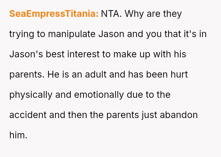 The original poster (OP) acted decisively to enforce his brother-in-law's (Jason's) boundary regarding contact with his parents, stemming from their previous abandonment following Jason's accident.