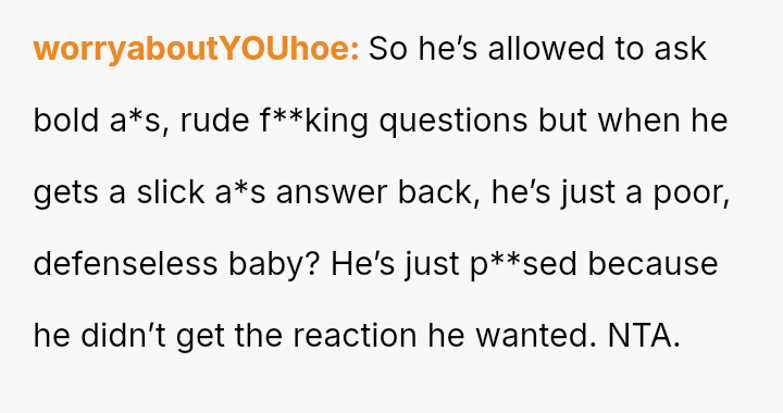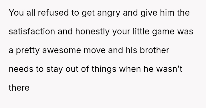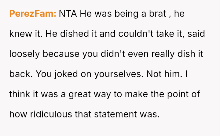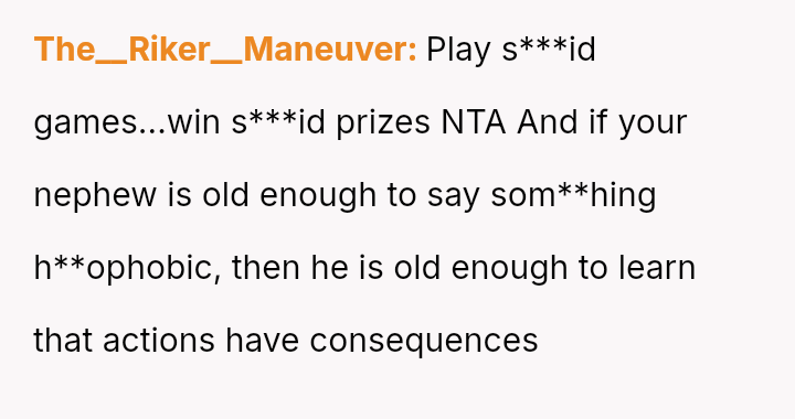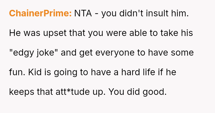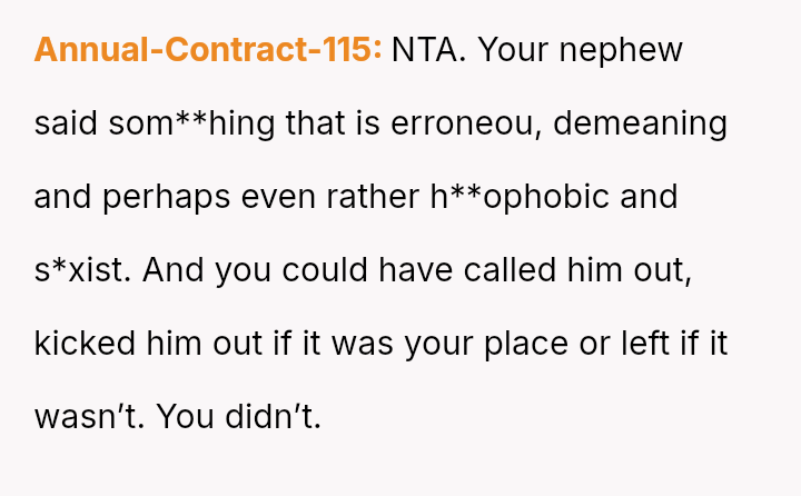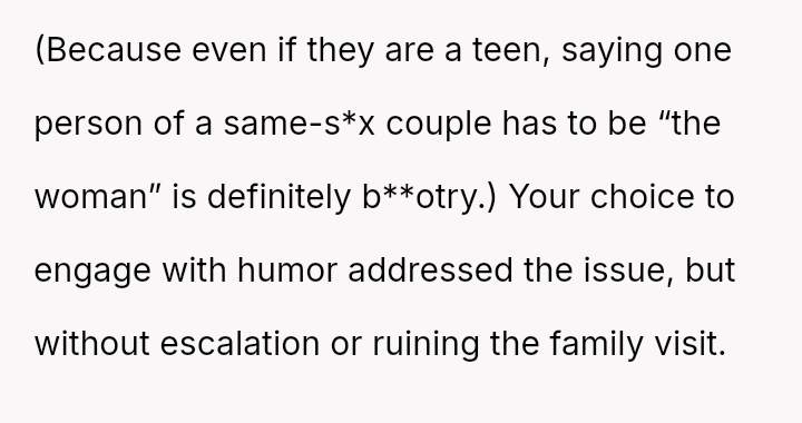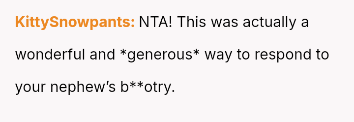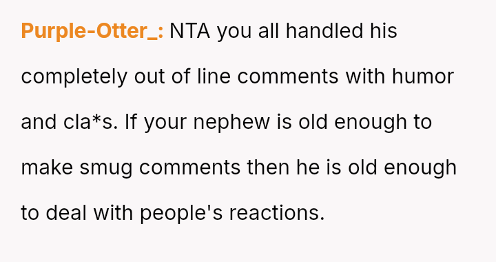 While the OP felt this diffused tension and subtly countered the nephew's b**oted comment without escalating conflict, the nephew perceived this collective action as an adult 'ganging up' on him, leading to genuine upset.