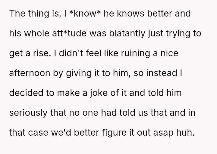 The original poster (OP) and their husband responded to a provocative and inappropriate question from their nephew by employing humor and turning the situation into a lighthearted, absurd game involving the entire family.
