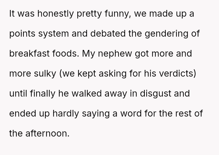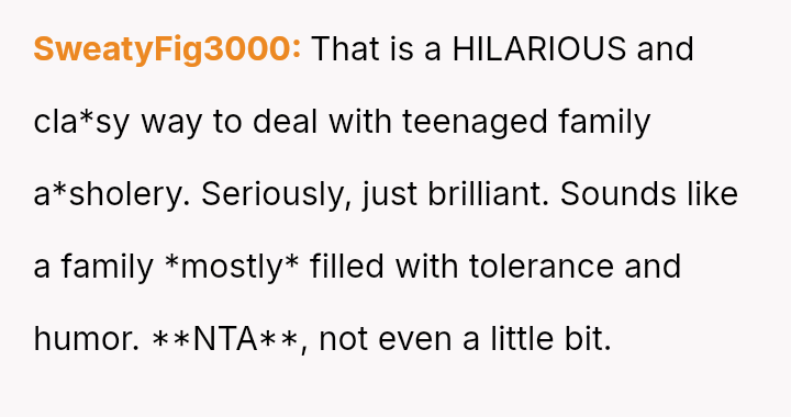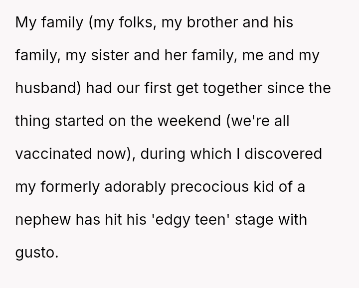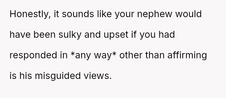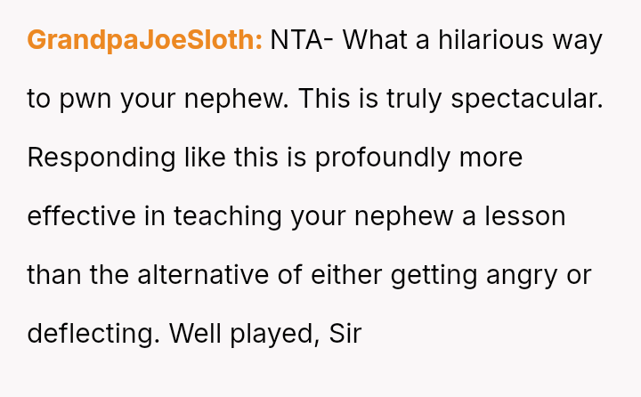 The core question remains whether the OP's indirect, humorous defense against the nephew's challenging behavior was a justified tactic to maintain family harmony and educate subtly, or if it unfairly targeted and isolated the teen, making the adults complicit in creating an uncomfortable environment for him. Should direct confrontation be prioritized over shared, absurdist deflection in such situations?