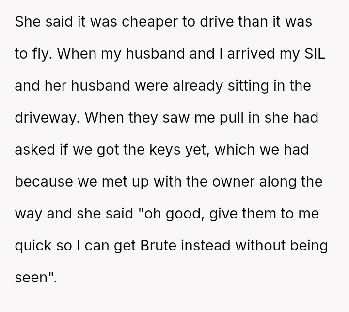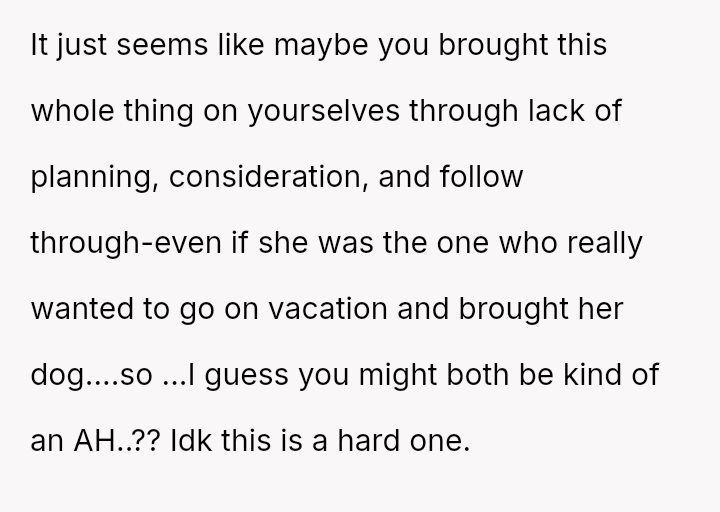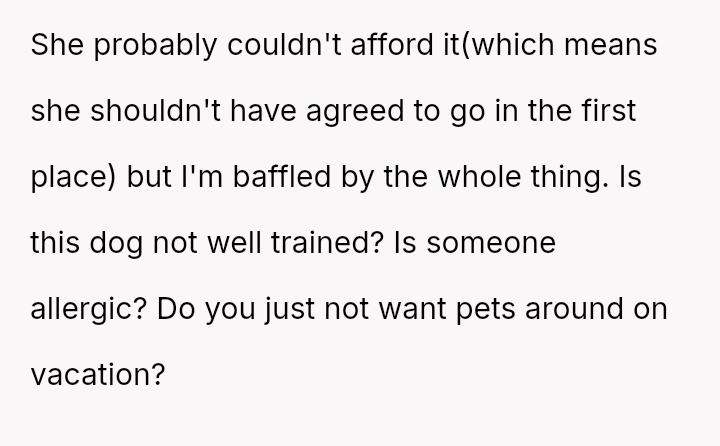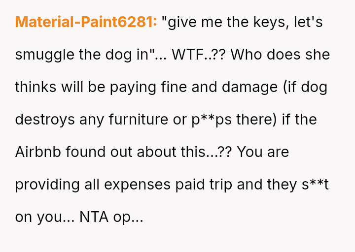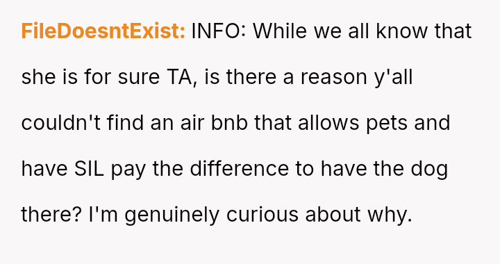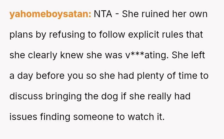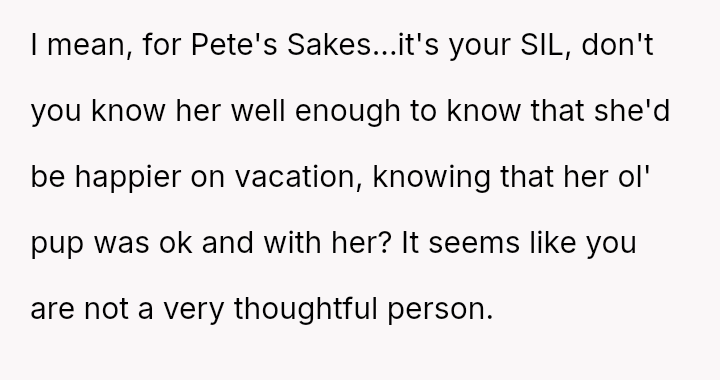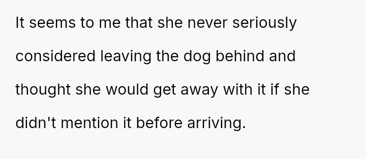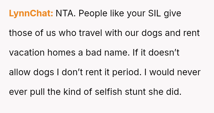 The original poster (OP) faced a direct v***ation of an agreed-upon condition for a vacation when their sister-in-law (SIL) secretly brought a dog to a non-pet-friendly rental, despite promising otherwise.