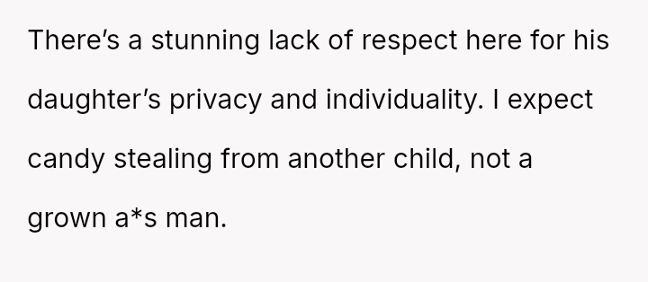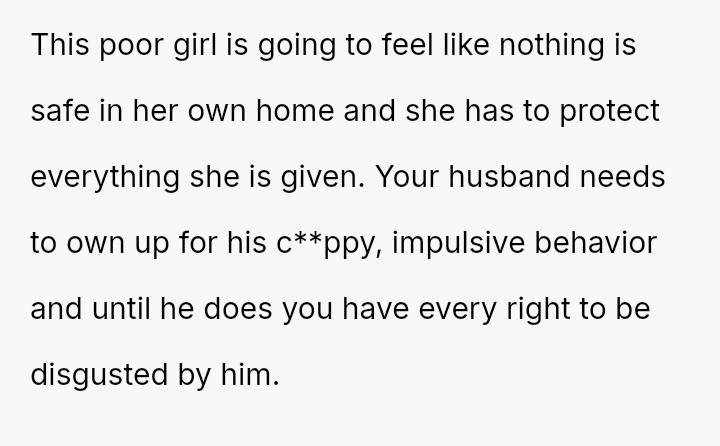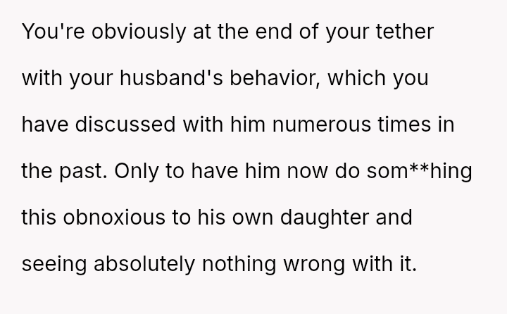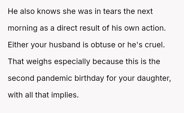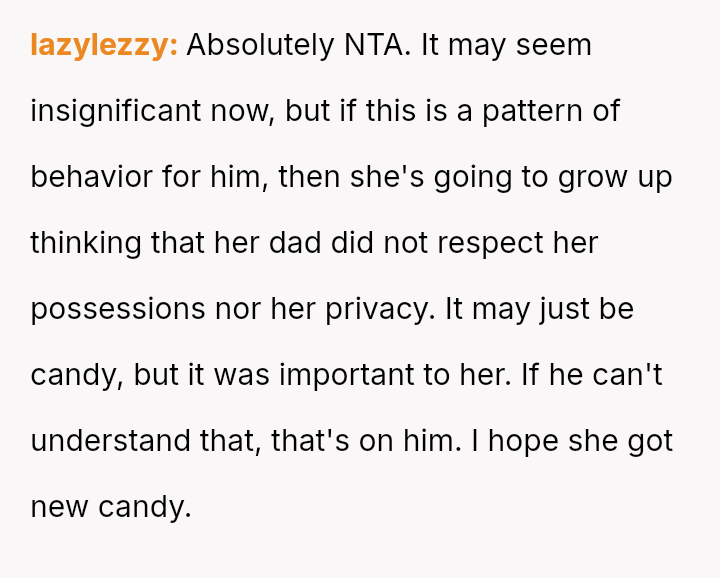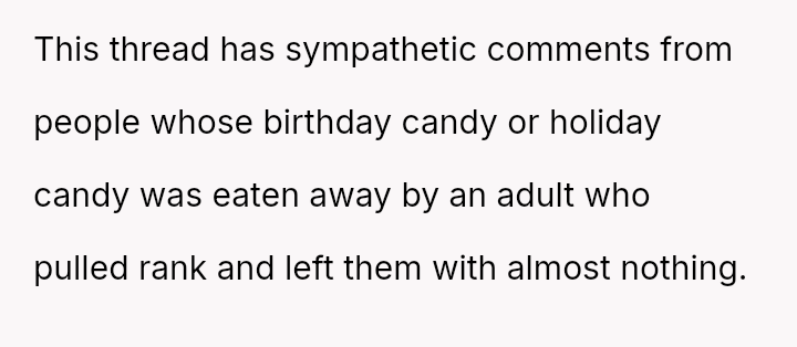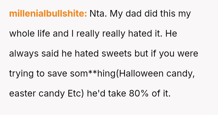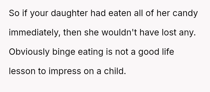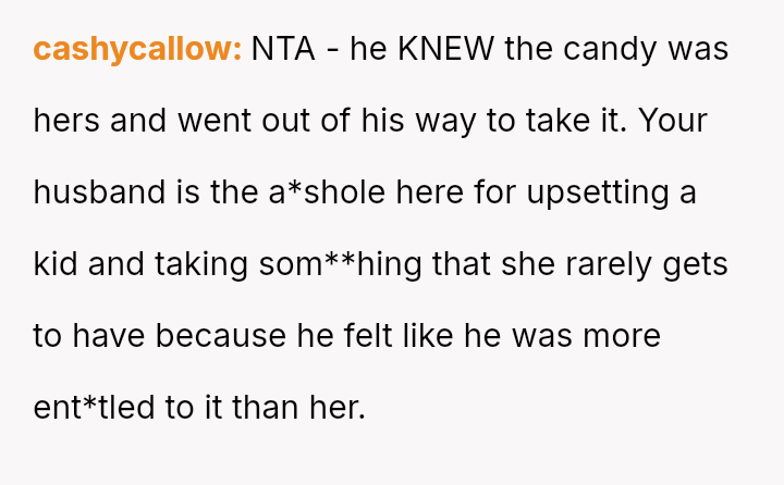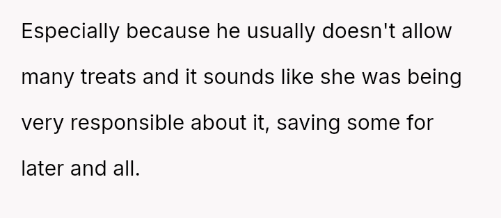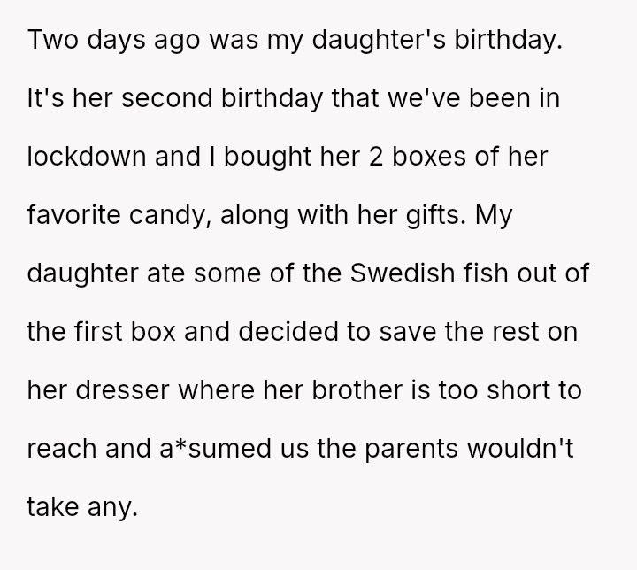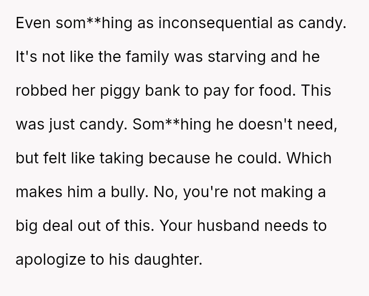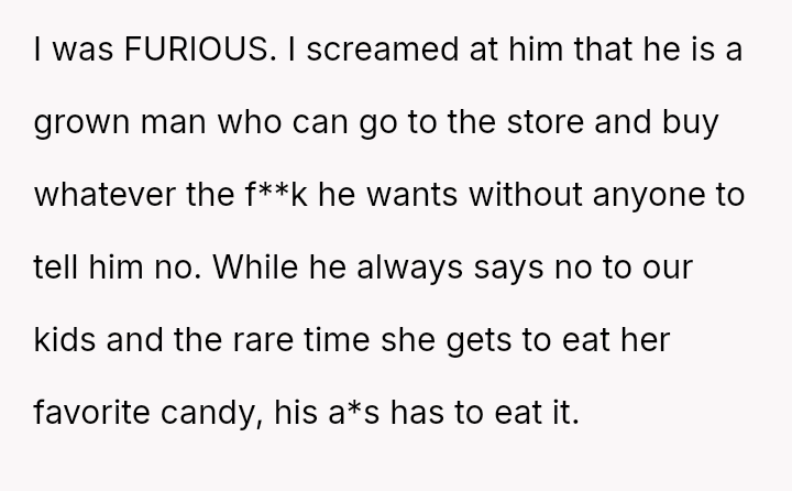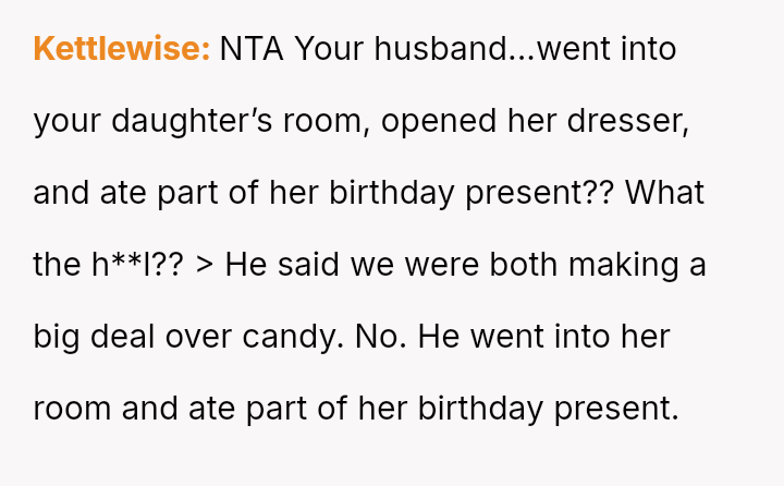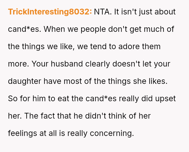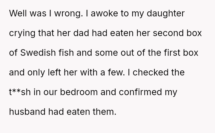 The original poster (OP) is deeply distressed by her husband's consumption of their daughter's birthday candy, viewing this action as a direct act of malice and a v***ation of trust, especially given his es**blished pattern of denying children's reasonable wants.