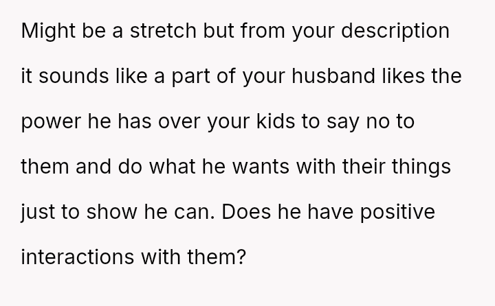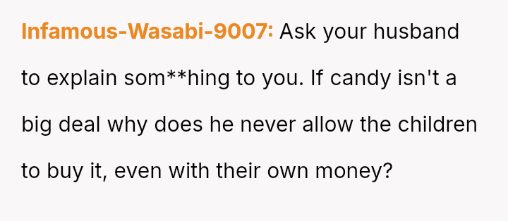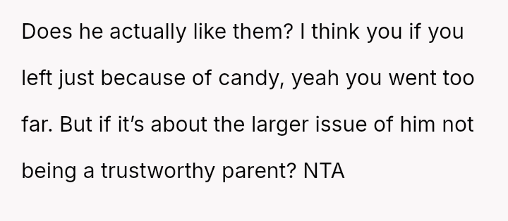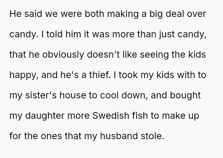 The core question is whether the husband's action of eating the child's special birthday candy, after consistently denying the children simple pleasures, const*tutes unforgivable behavior warranting temporary separation, or if the OP is overreacting to an isolated incident involving only candy?