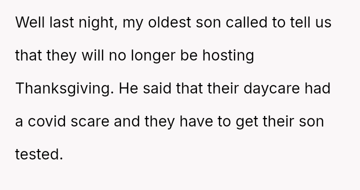 The original poster (OP) is facing significant emotional distress because the planned family Thanksgiving gathering has been canceled, primarily due to a conflict stemming from his dismissive comments towards his daughter-in-law's stress.