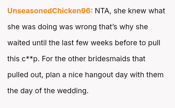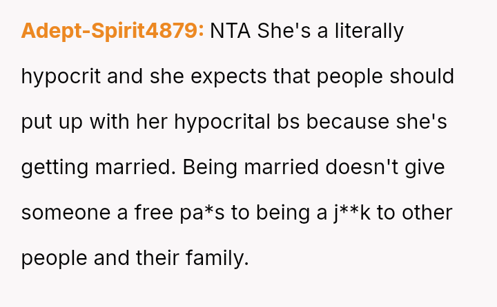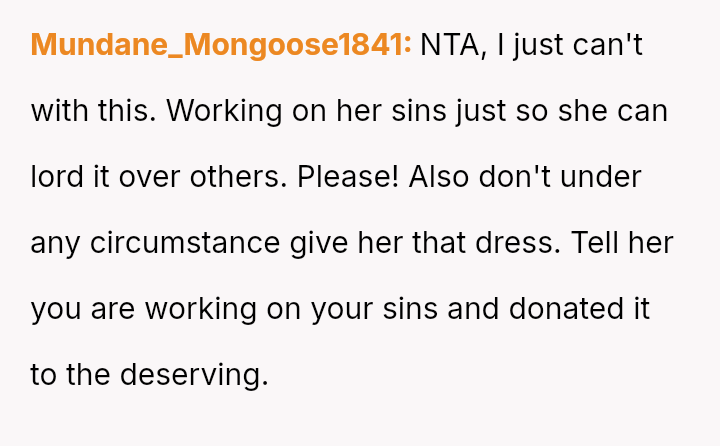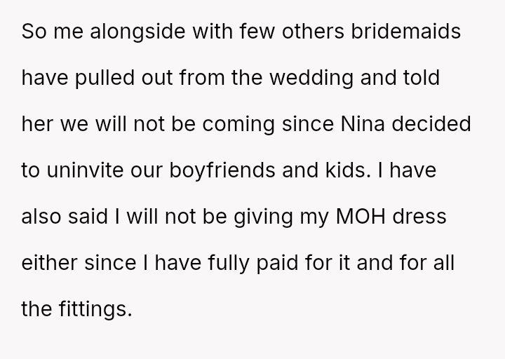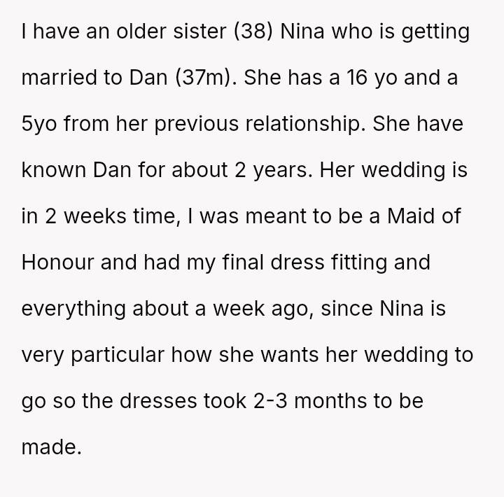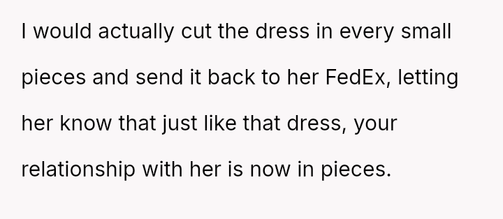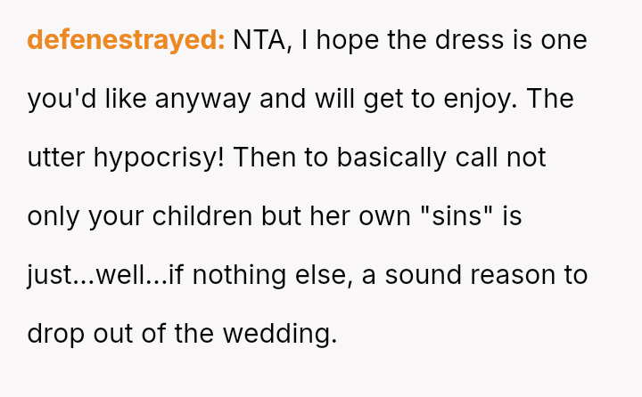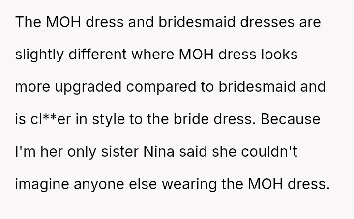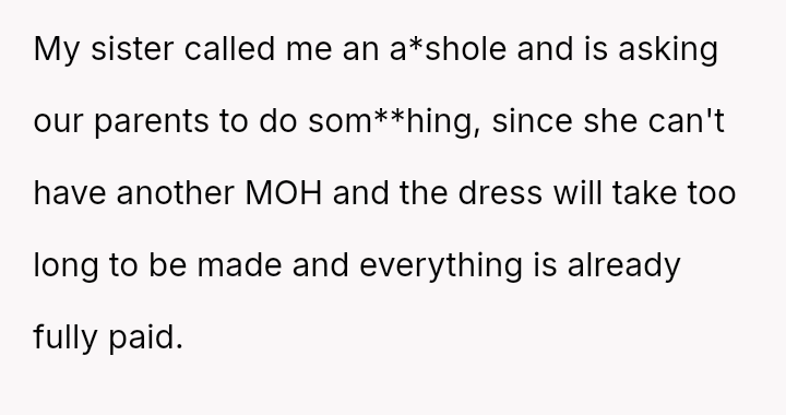 The OP reacted by withdrawing her support, including resigning as Maid of Honor and refusing to surrender the custom-made dress she paid for, leading to an intense family rift.