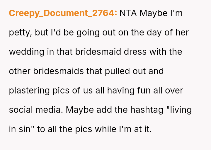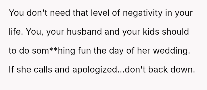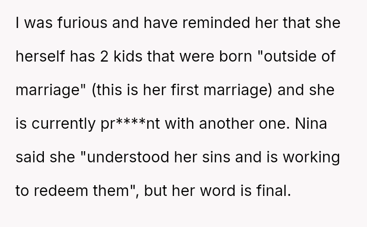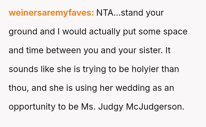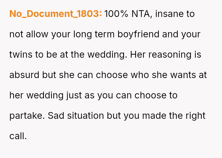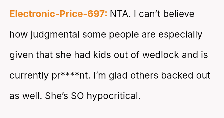 Given the sister's public judgment of the OP's long-term relationship and children while ignoring her own similar history, should the OP stand firm on her decision to prioritize her immediate family's dignity over her sister's wedding wishes, or is the financial and logistical disruption caused by her withdrawal an overreaction?