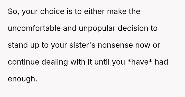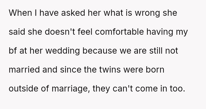 The original poster (OP) is facing a significant conflict arising from her sister's exclusionary wedding demands, which targeted her unmarried status and her children.