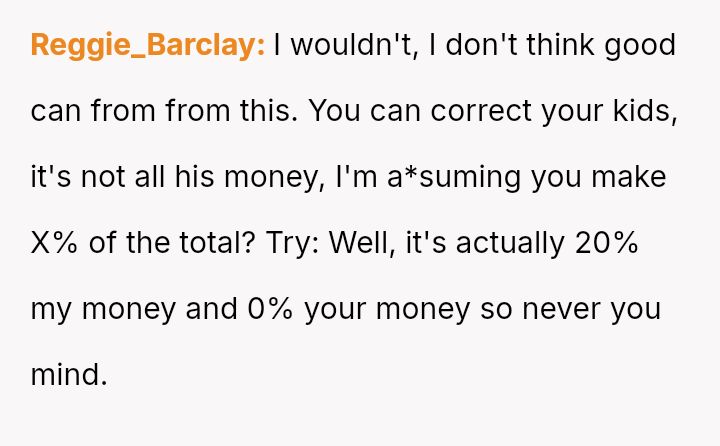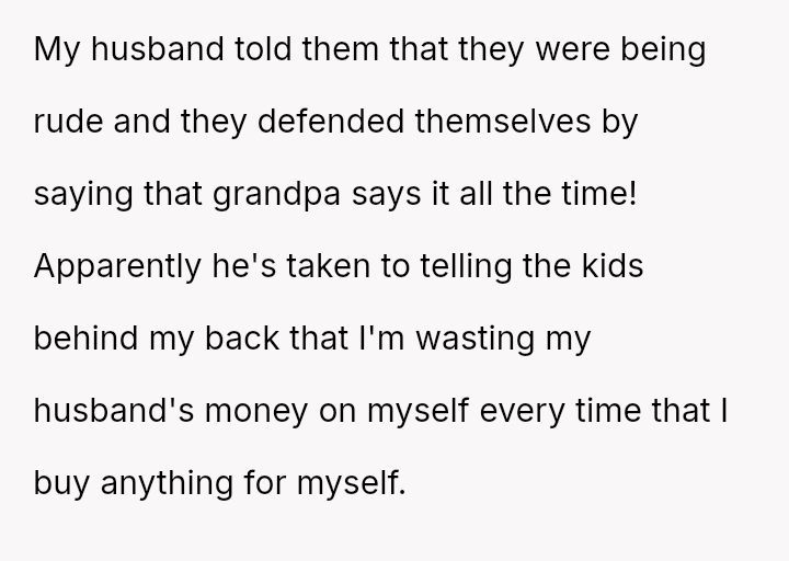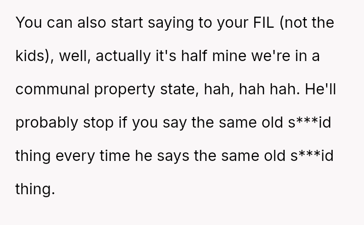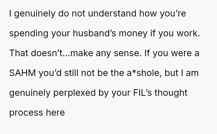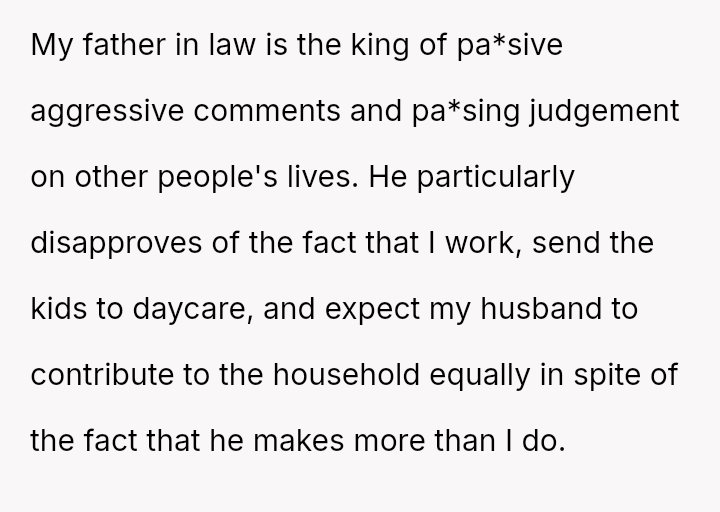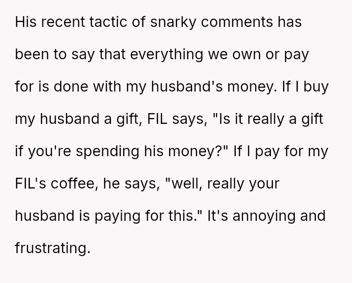 The original poster is deeply hurt and angry because their father-in-law is using manipulative, pa*sive-aggressive comments to undermine the poster's contributions and value within the family structure, specifically targeting the poster's use of shared finances.