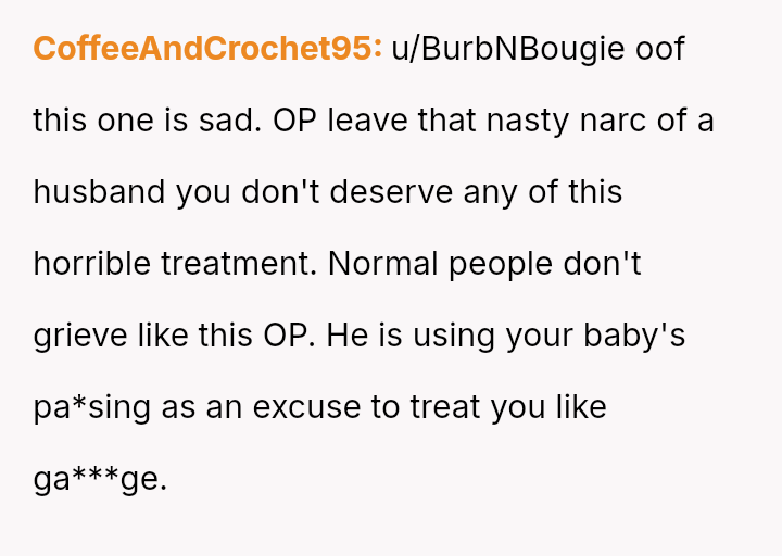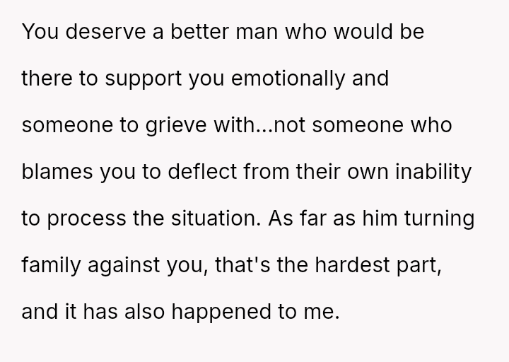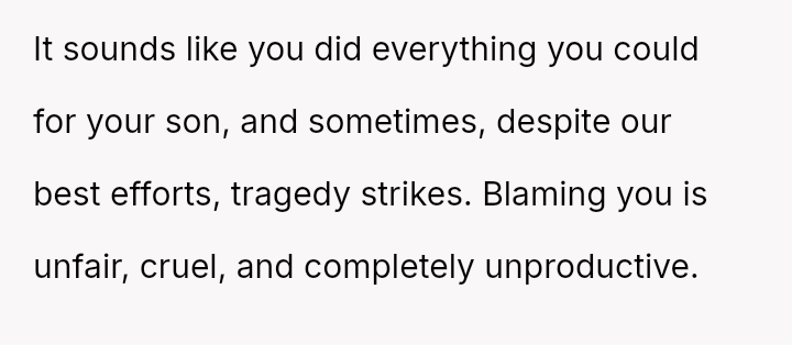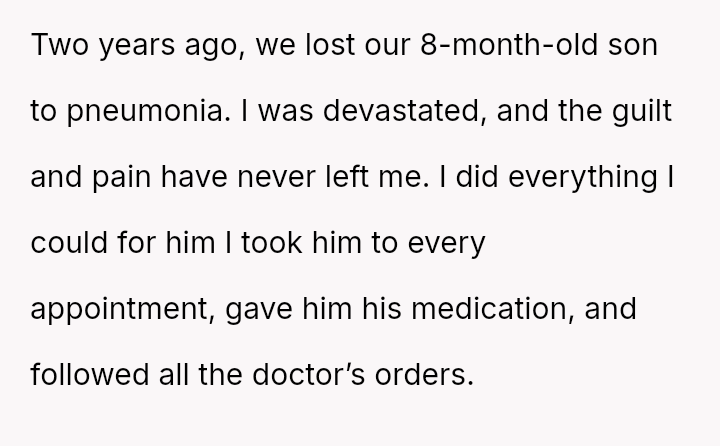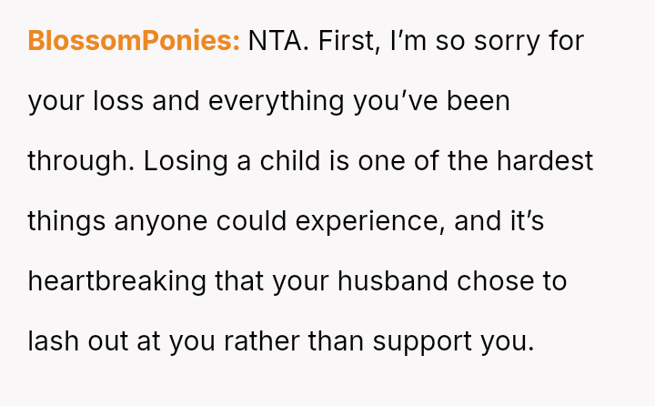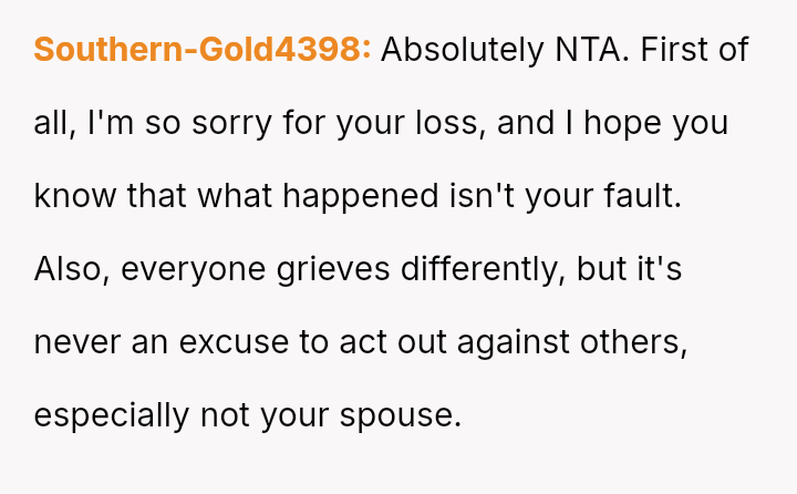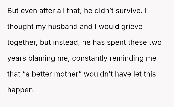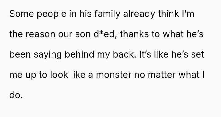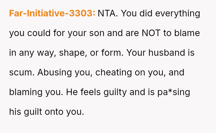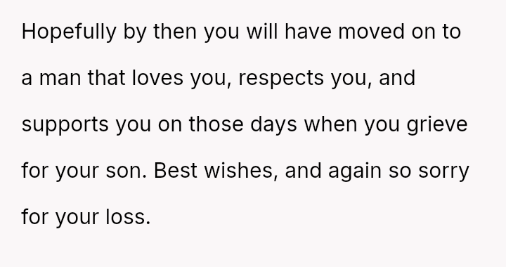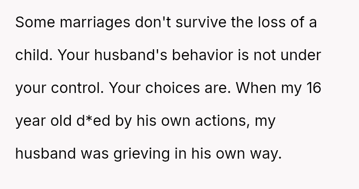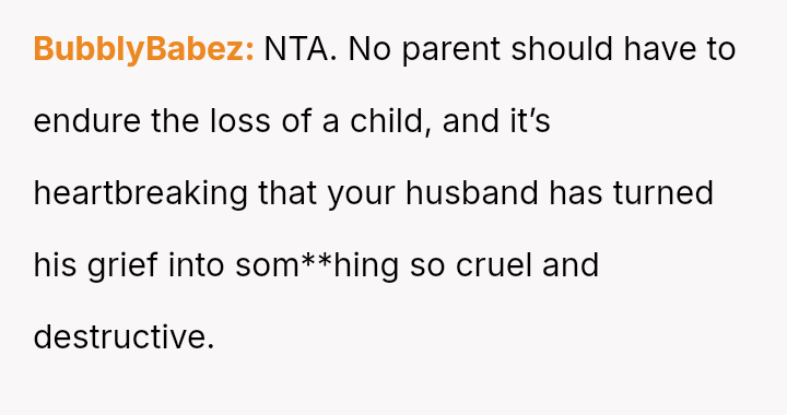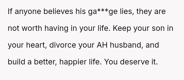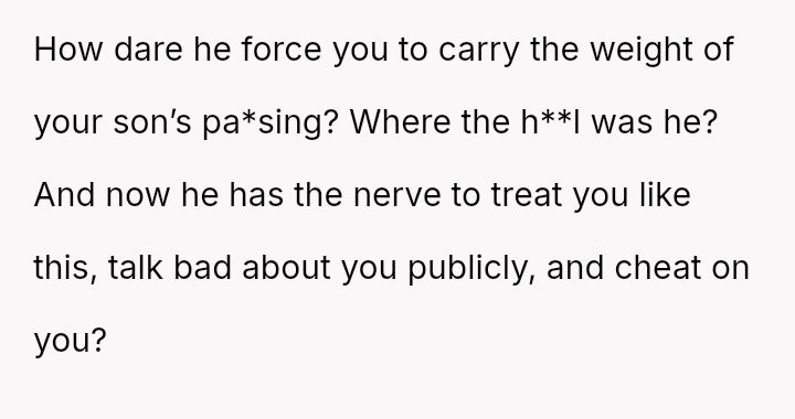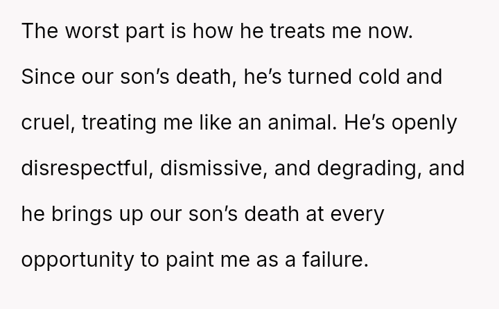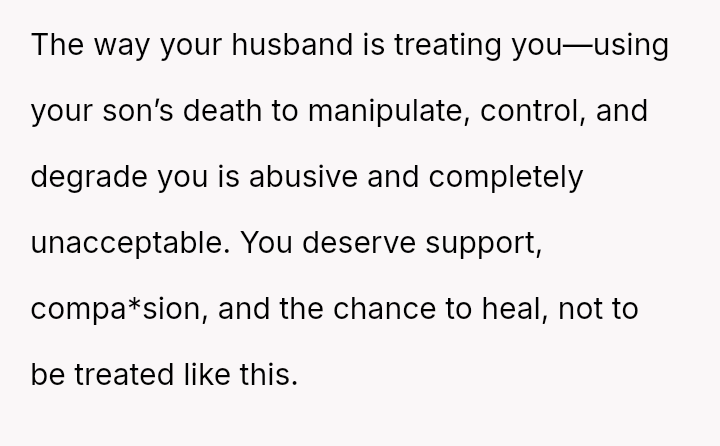 The original poster (OP) is trapped between immense personal grief over the loss of her son and ongoing emotional and verbal a**se from her husband, compounded by his in***elity.