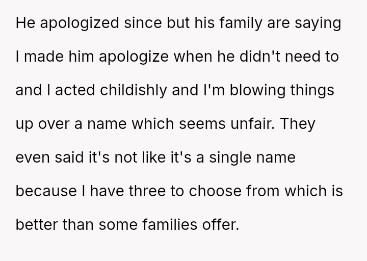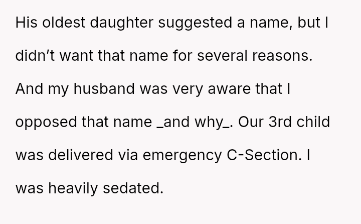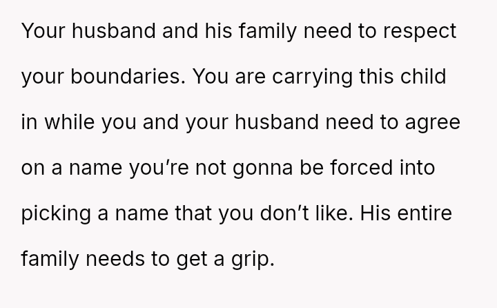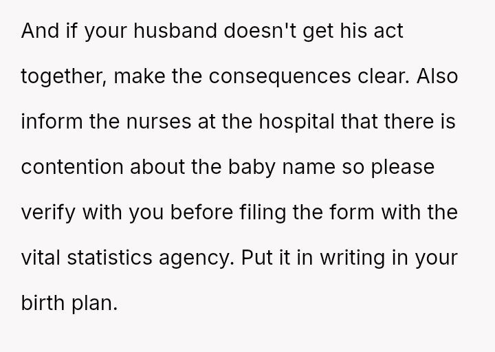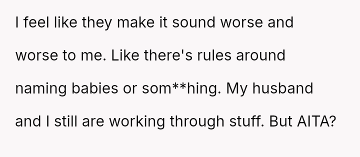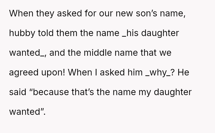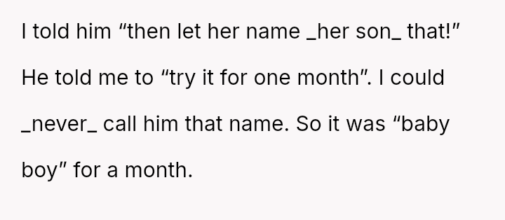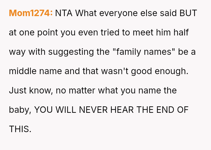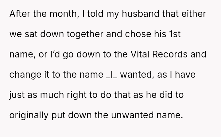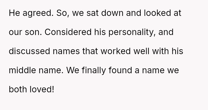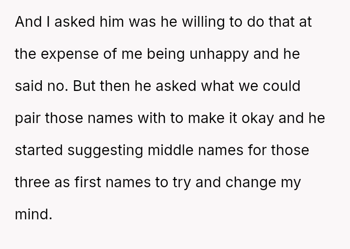 When the user expressed unhappiness, the conflict escalated through weeks of discussions where the husband attempted to compromise by suggesting name pairings, but the user felt pressured, leading her to pause the discussions entirely.