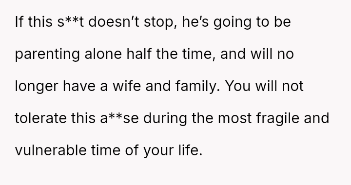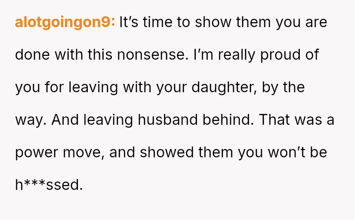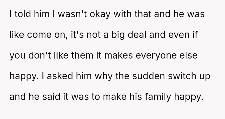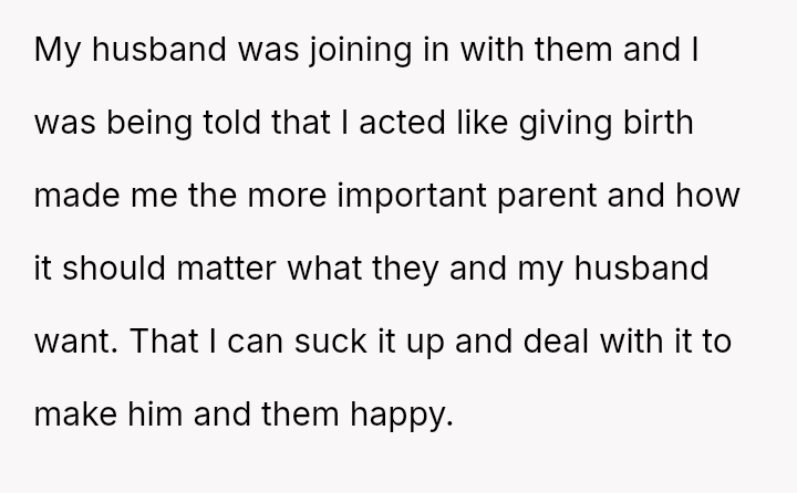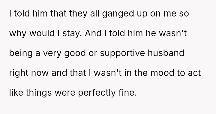 This pressure culminated in a family event where the wife felt ganged up on and unsupported by her husband, causing her to leave abruptly.