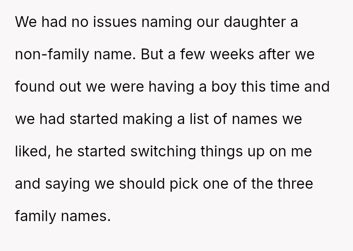 After learning they were expecting a boy, the husband changed his stance and began pushing to use one of the three family names, despite the user's initial agreement against obligatory naming.