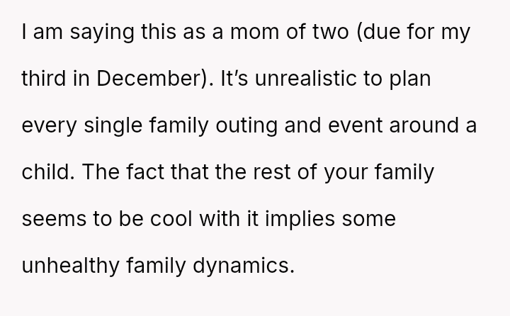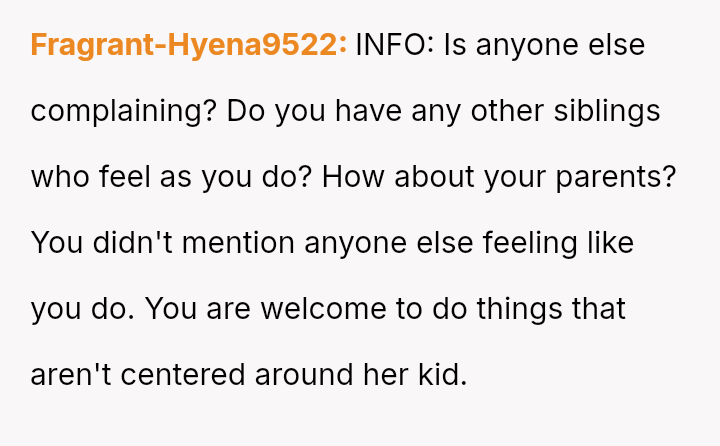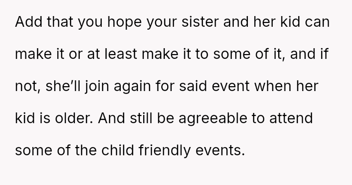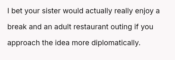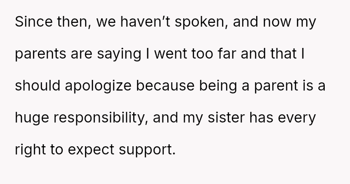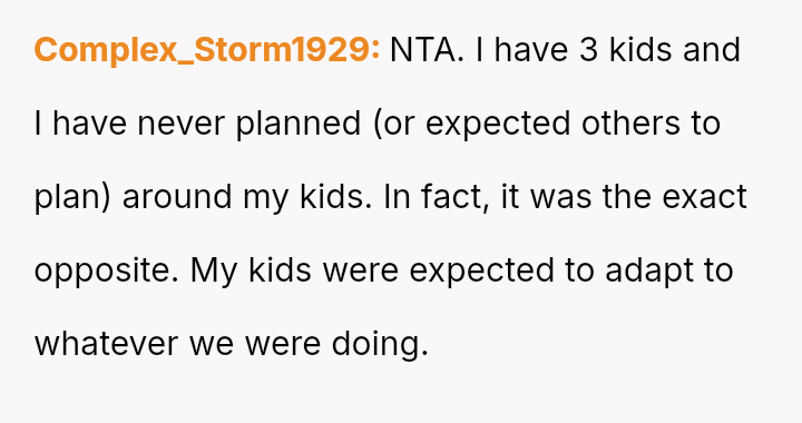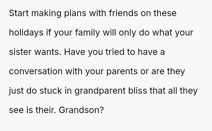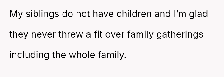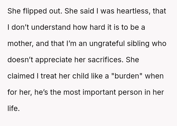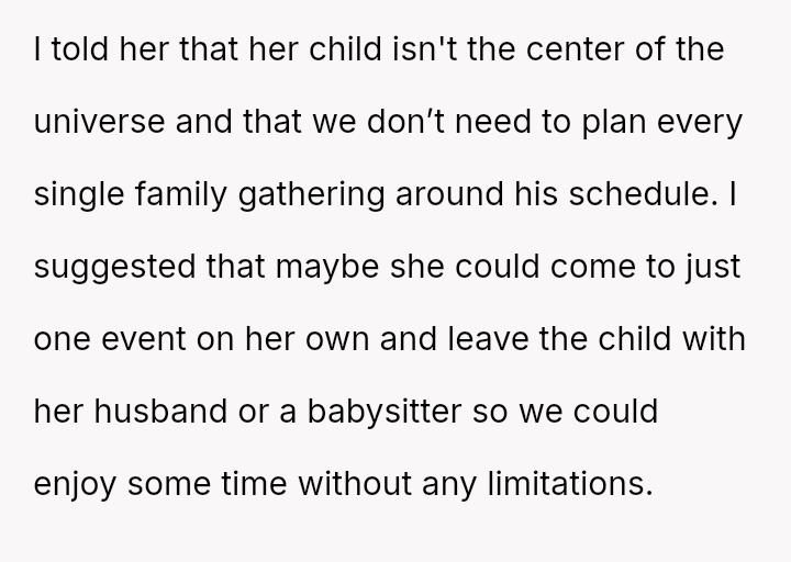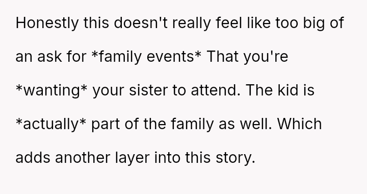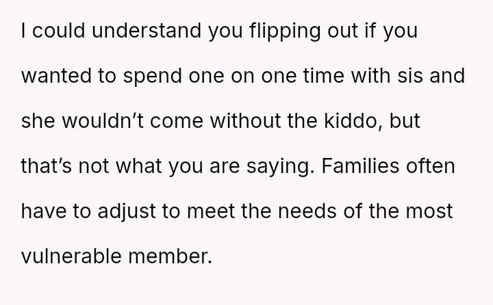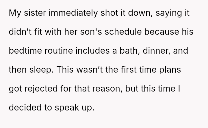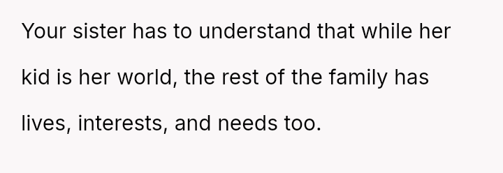 The central conflict arises when the poster attempts to a*sert a need for adult-focused time, which the sister immediately rejects based on her child's schedule, leading to an intense confrontation where the sister accused the poster of being heartless, while the parents sided with the sister, emphasizing the perceived demands of parenthood.