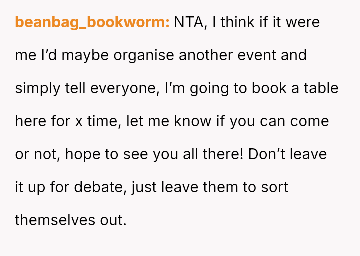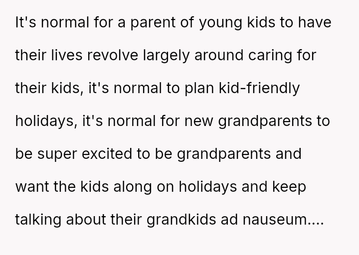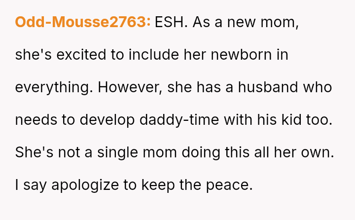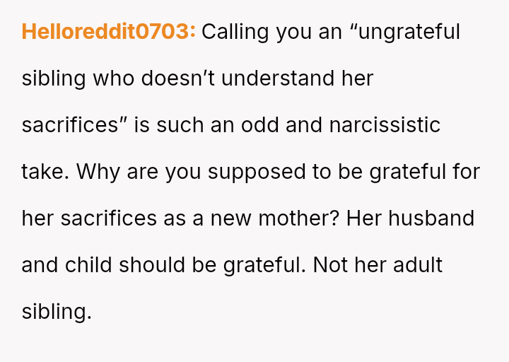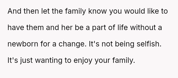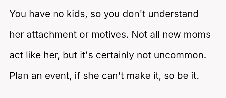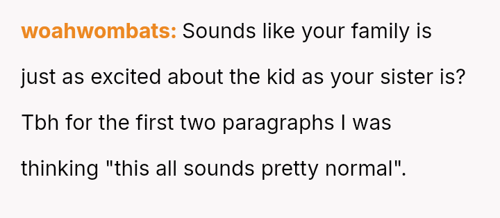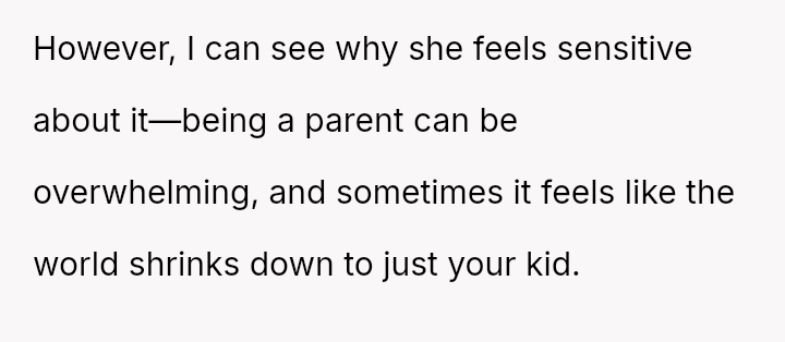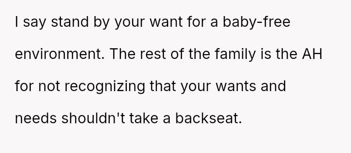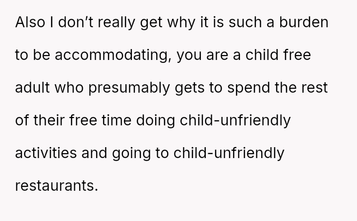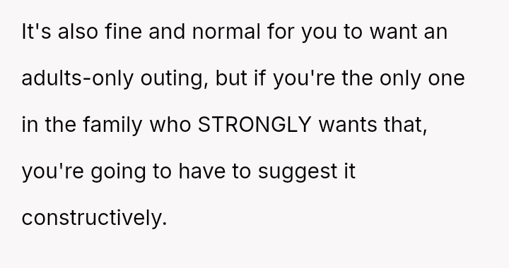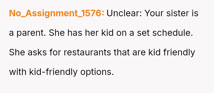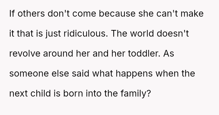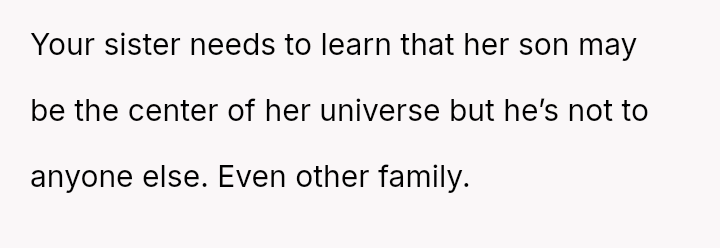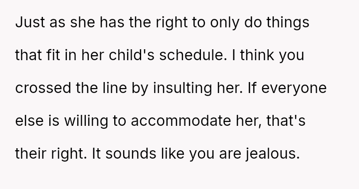 The central conflict arises when the poster attempts to a*sert a need for adult-focused time, which the sister immediately rejects based on her child's schedule, leading to an intense confrontation where the sister accused the poster of being heartless, while the parents sided with the sister, emphasizing the perceived demands of parenthood.